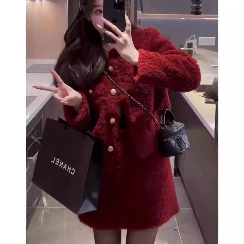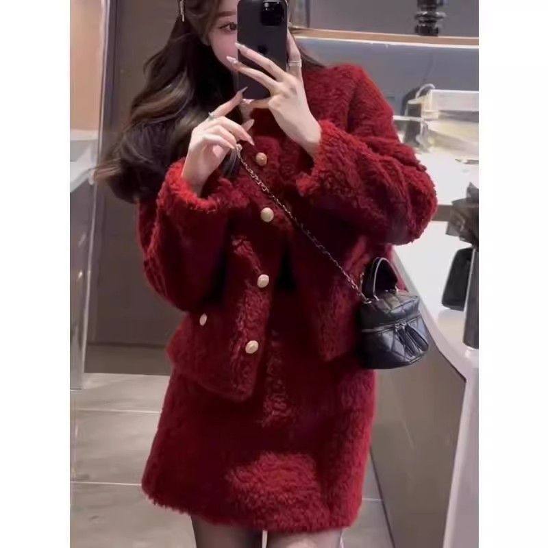 韩系名媛气质红色毛绒上衣套装裙女冬季新款时尚短裙小香风两件套