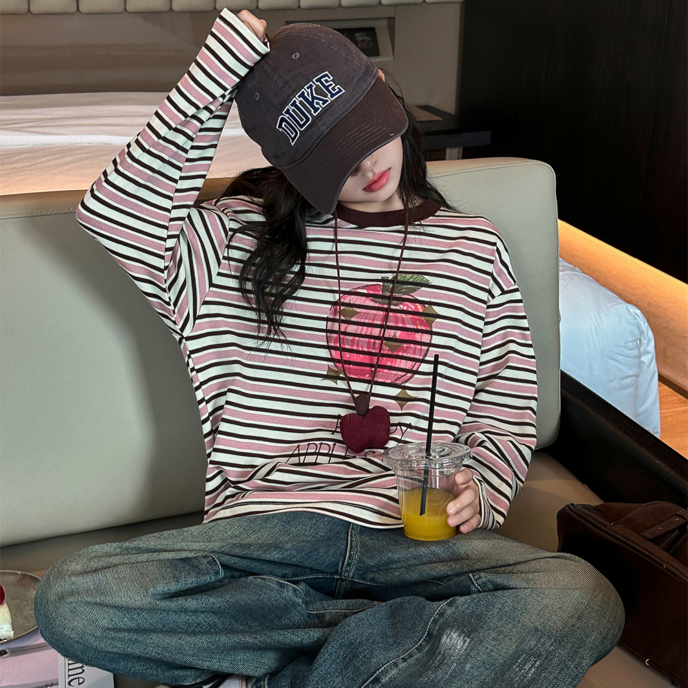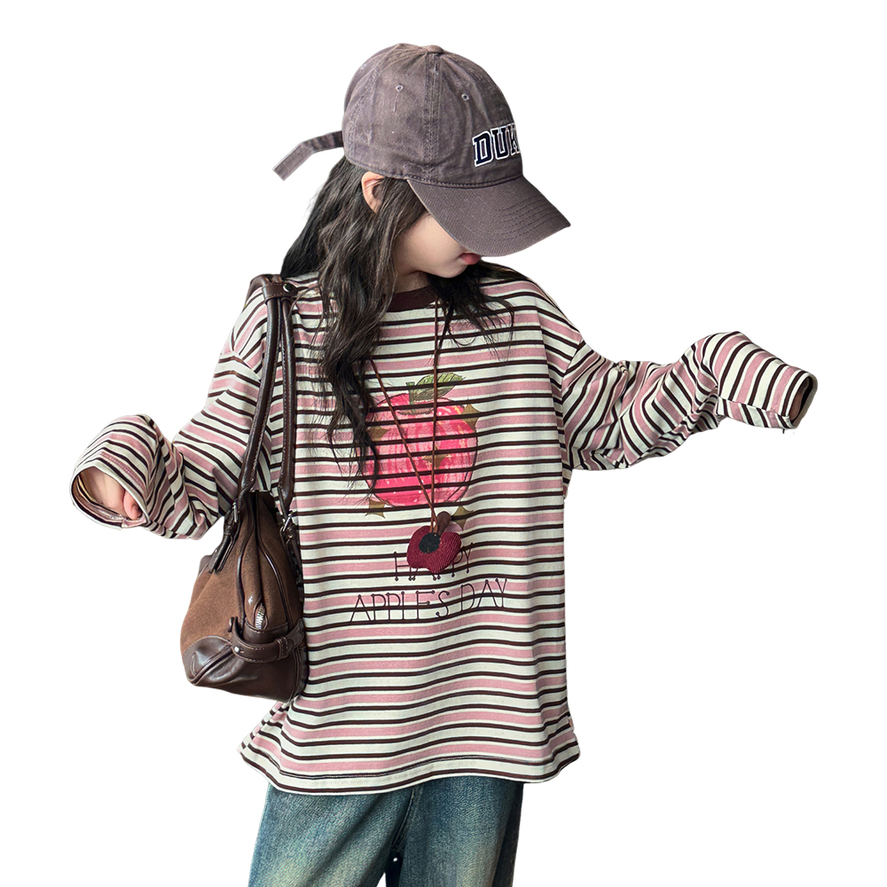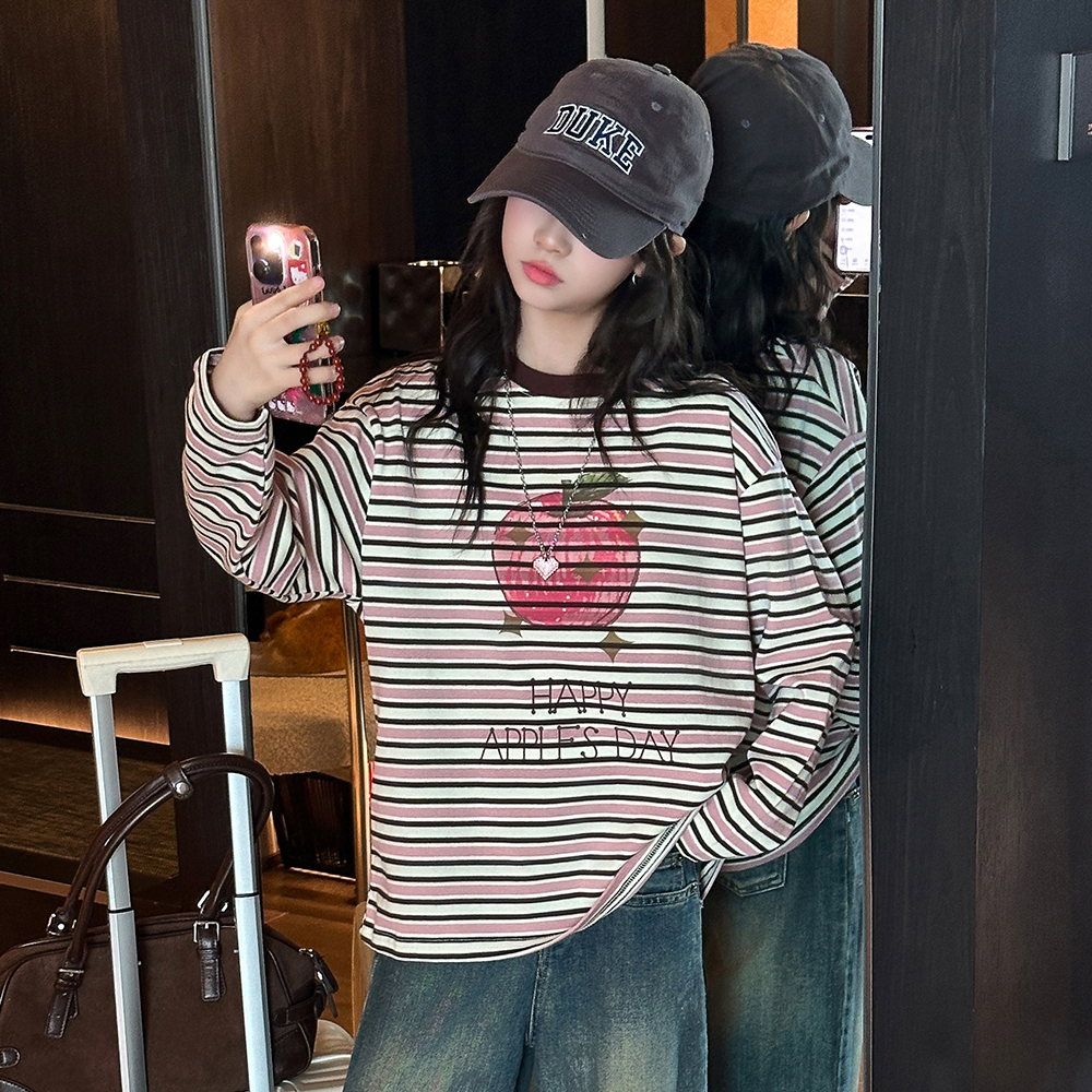 女童洋气条纹长袖T恤衫春秋装新款2025时髦中大童圆领打底衫上衣T