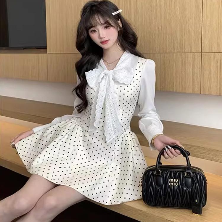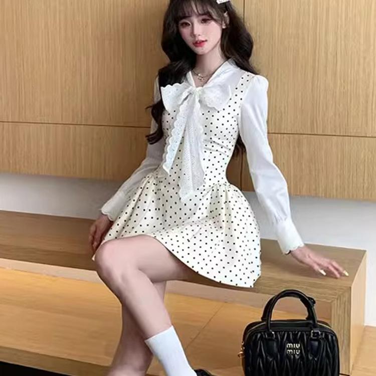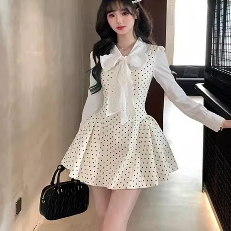 法式复古波点拼接假两件连衣裙女春季2025新款高级感收腰长袖短裙