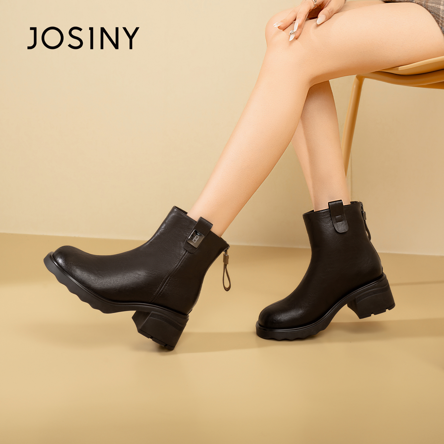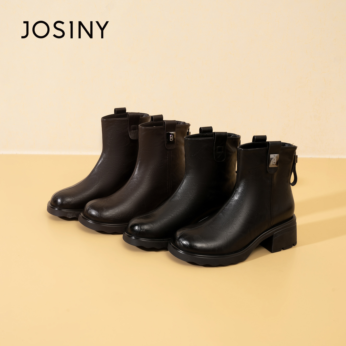 卓诗尼25冬季马丁靴时尚百搭粗跟气质圆头中跟侧拉链气质短靴中筒