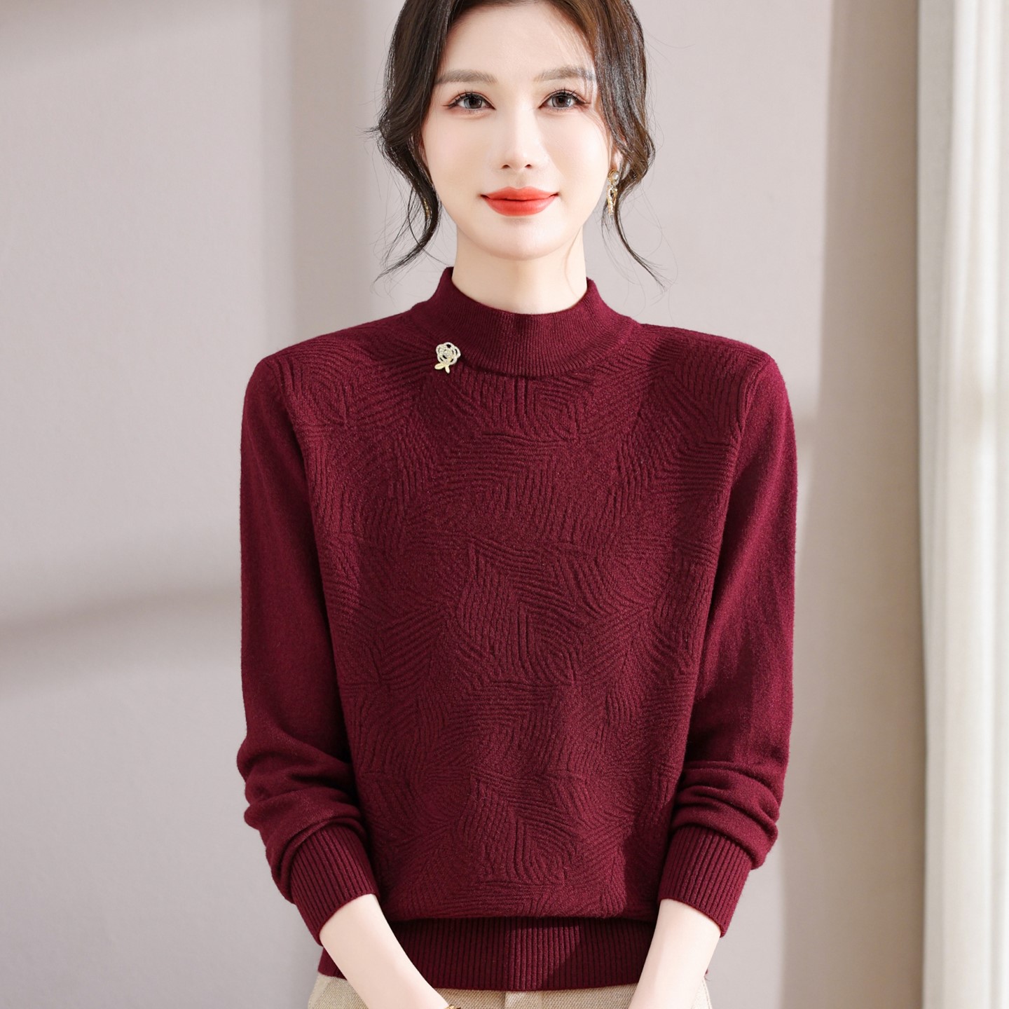 妈妈秋装针织衫上衣纯色羊毛衣中老年女秋冬半高领加厚保暖打底衫