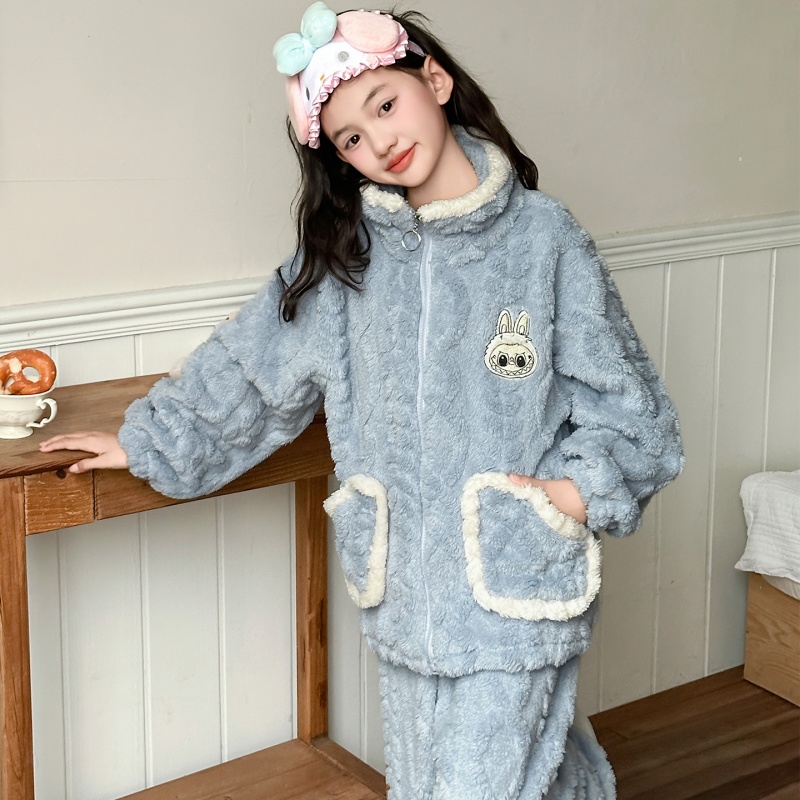 女童法兰绒睡衣秋冬新款中大童双面绒家居服套装儿童开衫保暖套装