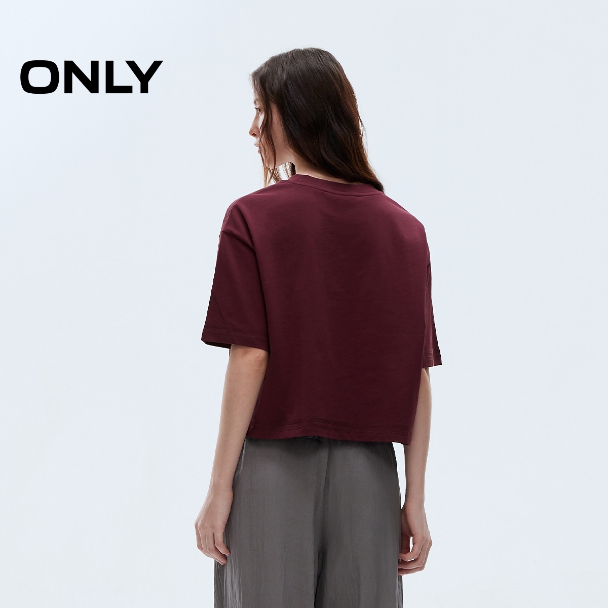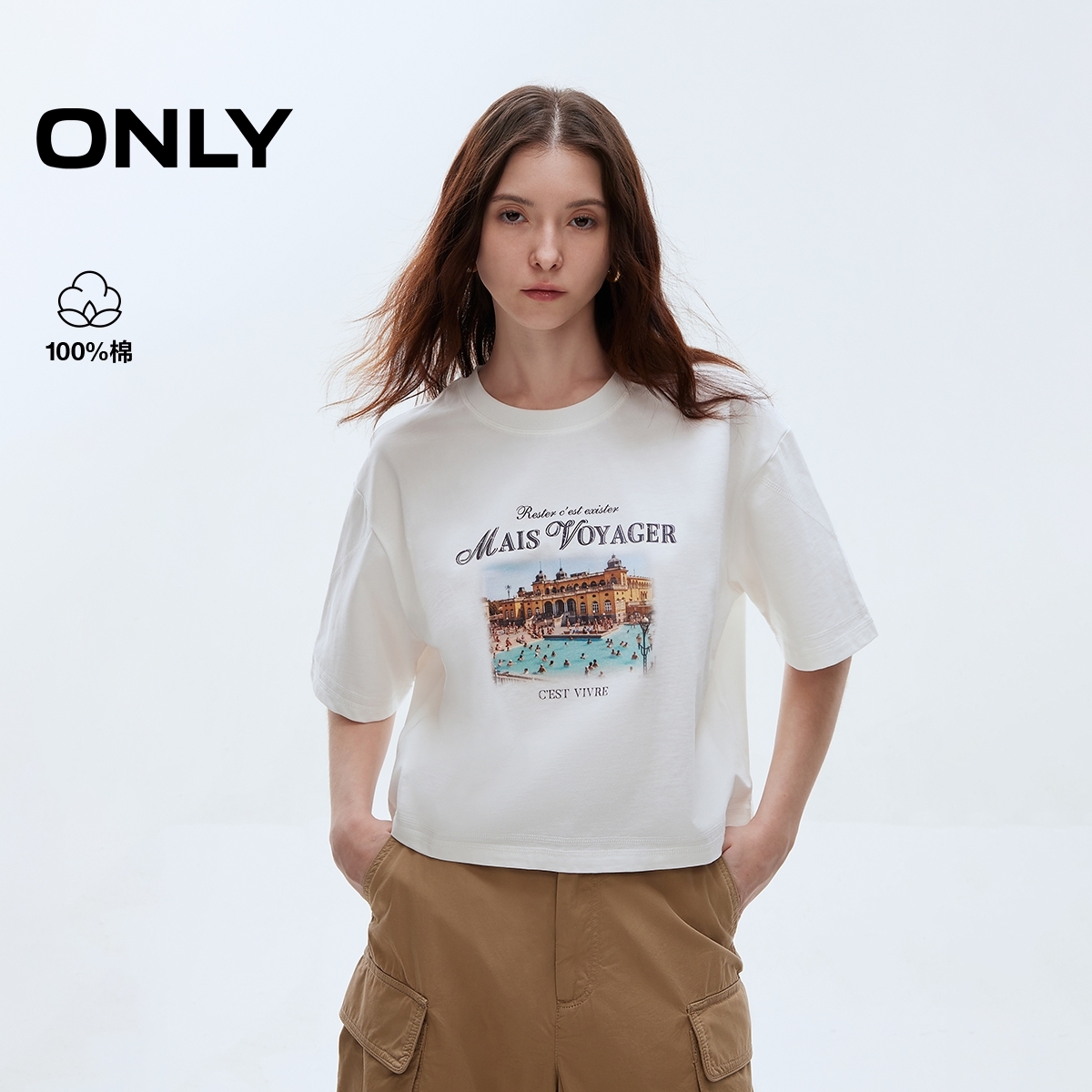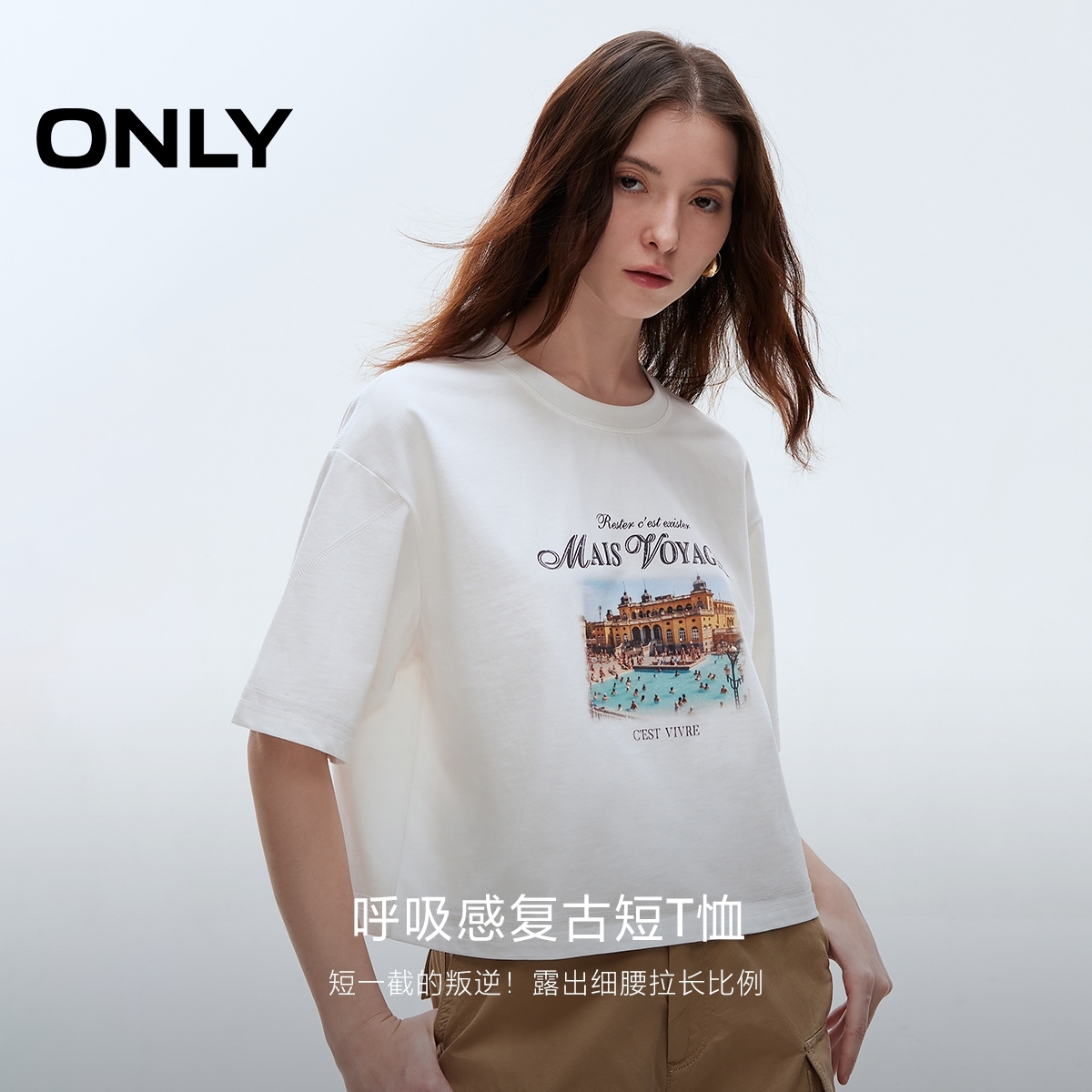 ONLY2025夏季新款纯棉复古印花宽松遮肉圆领落肩短袖短款T恤女