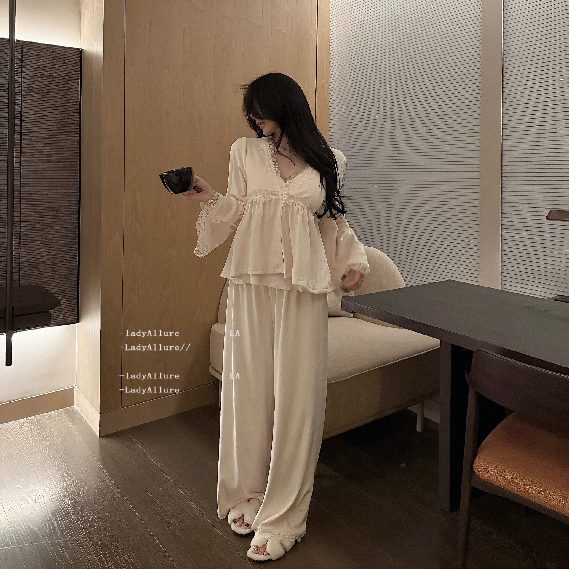 「LA」丝芙特*冬季蕾丝纯欲海岛绒舒适家居服加厚睡衣三件套装女
