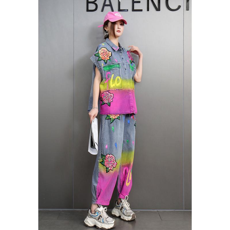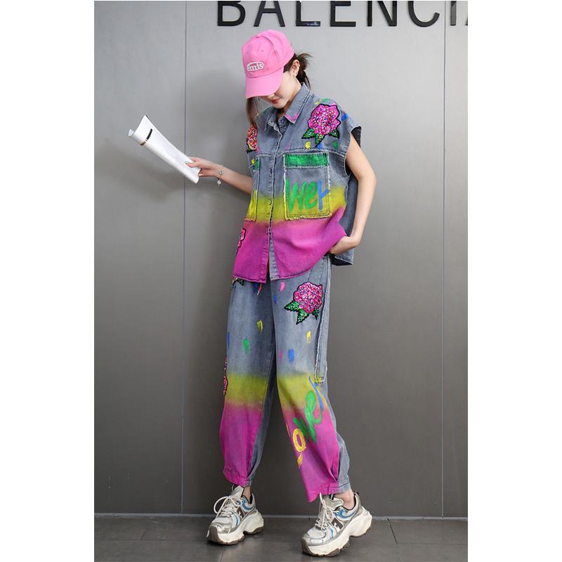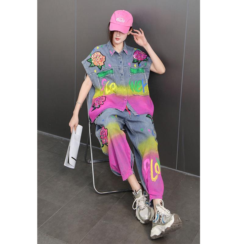 欧洲站2025秋新款牛仔套装女时尚彩绘涂鸦牛仔外套九分裤两件宽松
