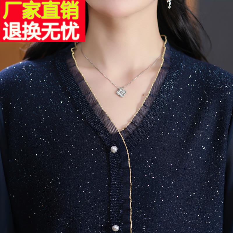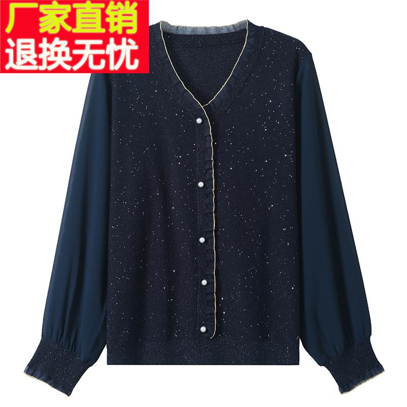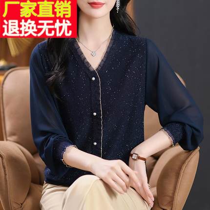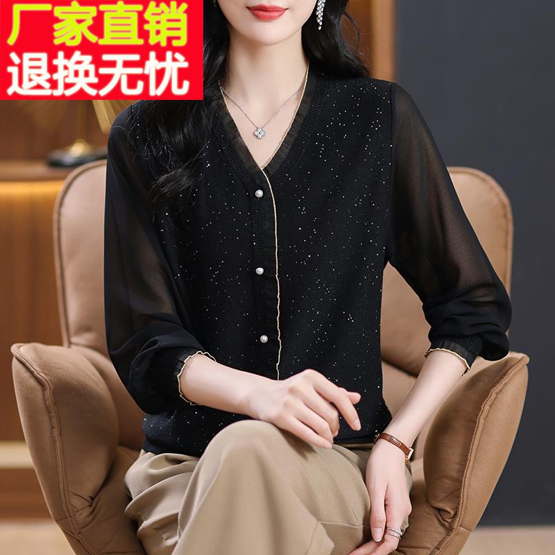 中年妈妈春装冰丝针织衫女宽松大码纱袖上衣洋气V领桑蚕丝t恤小衫