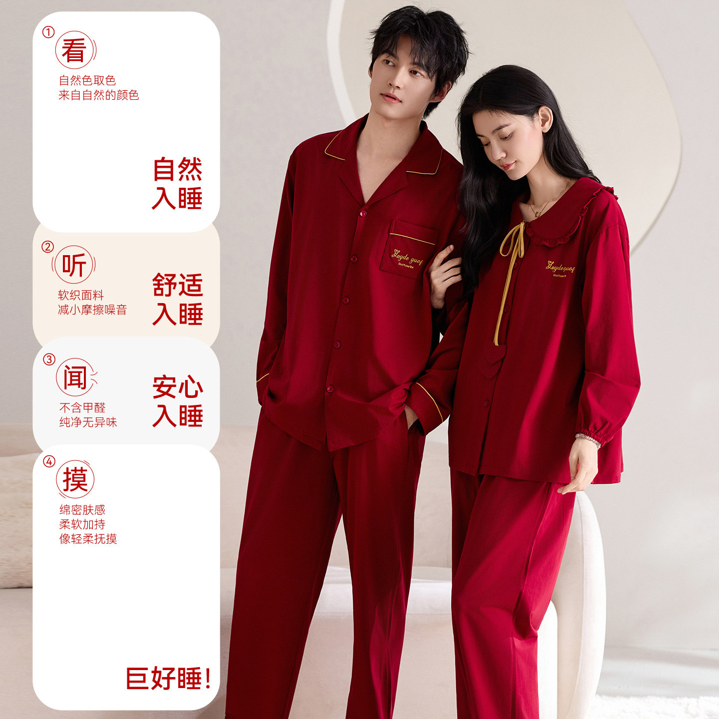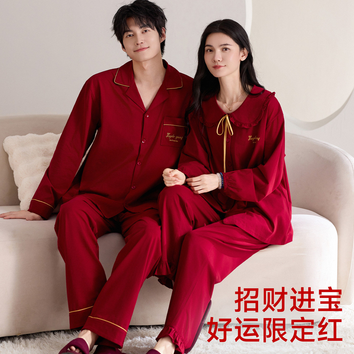 猫人情侣纯棉睡衣秋冬新款红色新婚本命年大码外穿家居服男女套装