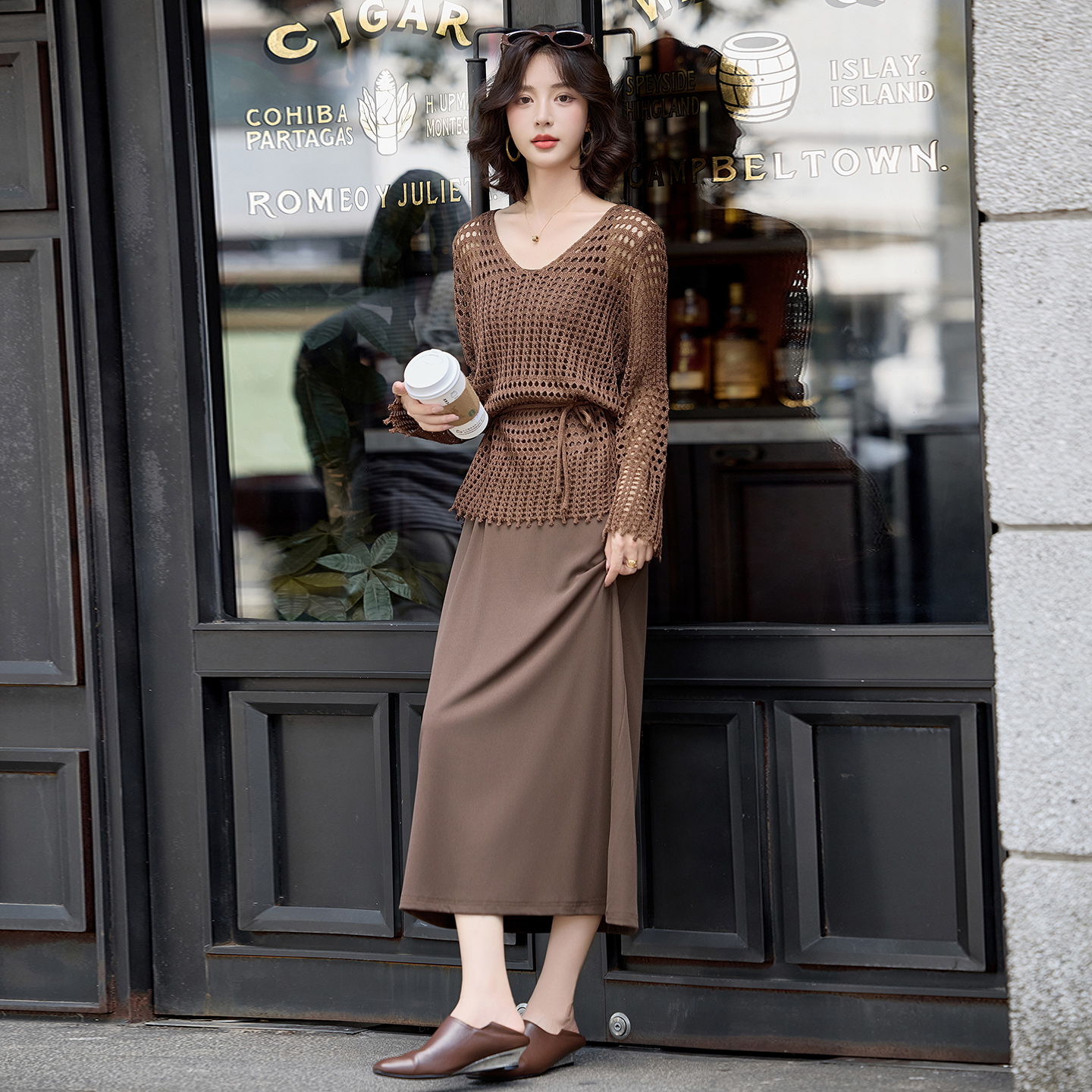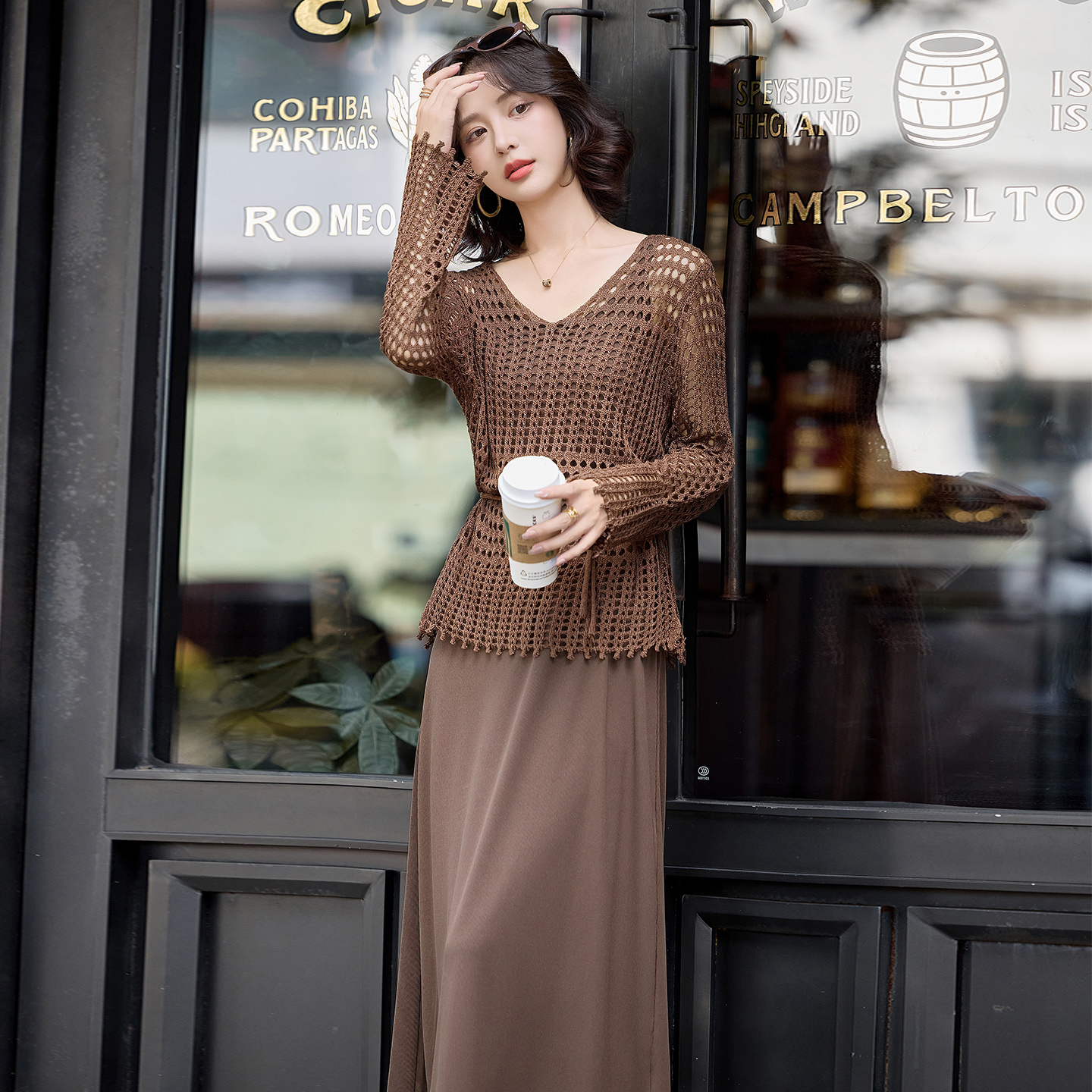 法式复古镂空针织罩衫搭配吊带裙两件套女2025秋季新款时尚套装裙