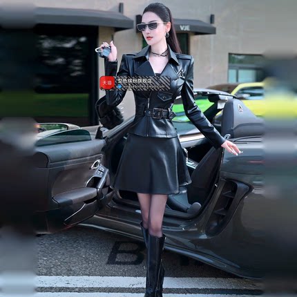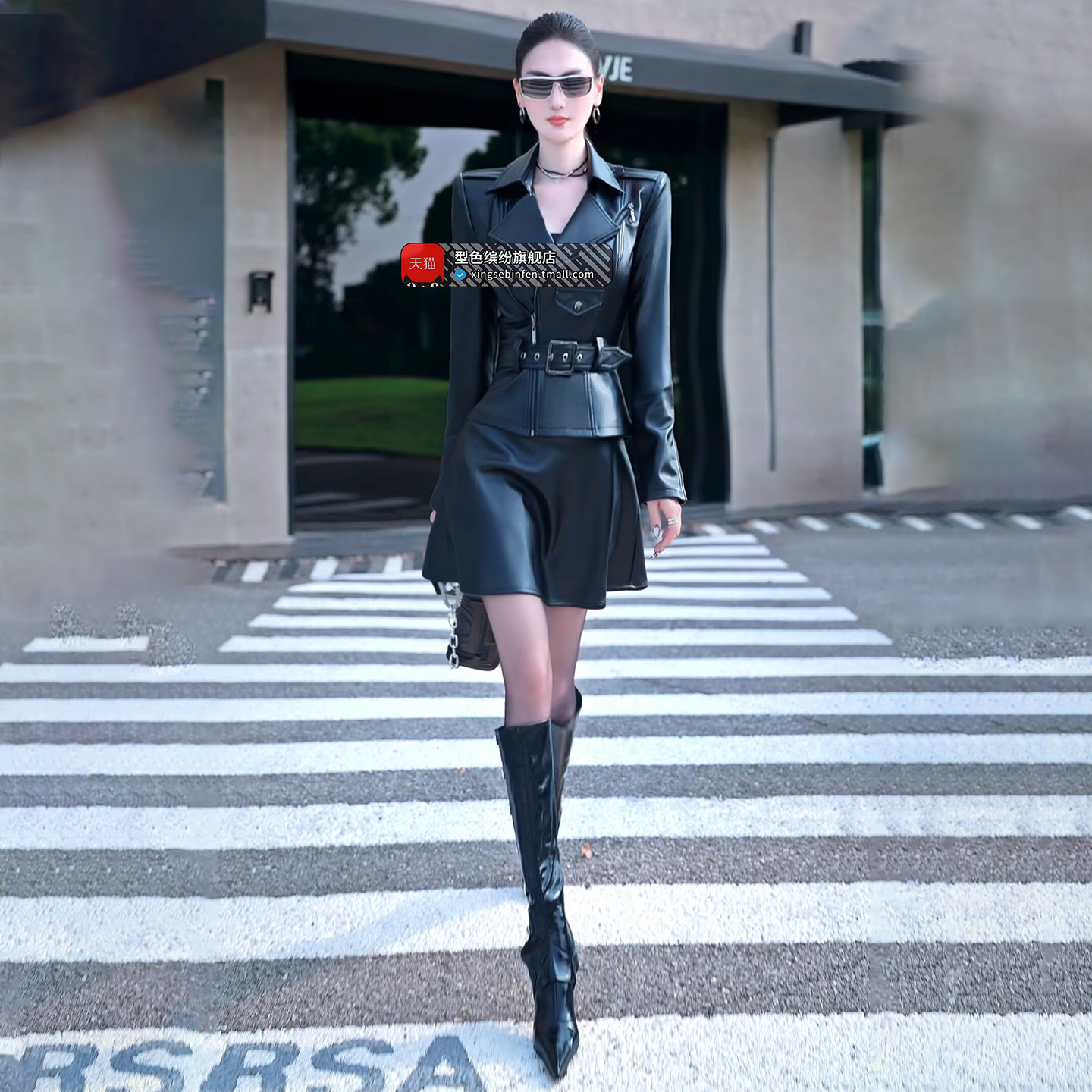 秋季英伦机车风仿PU套装裙2025新款帅气干练修身夹克短裙两件套