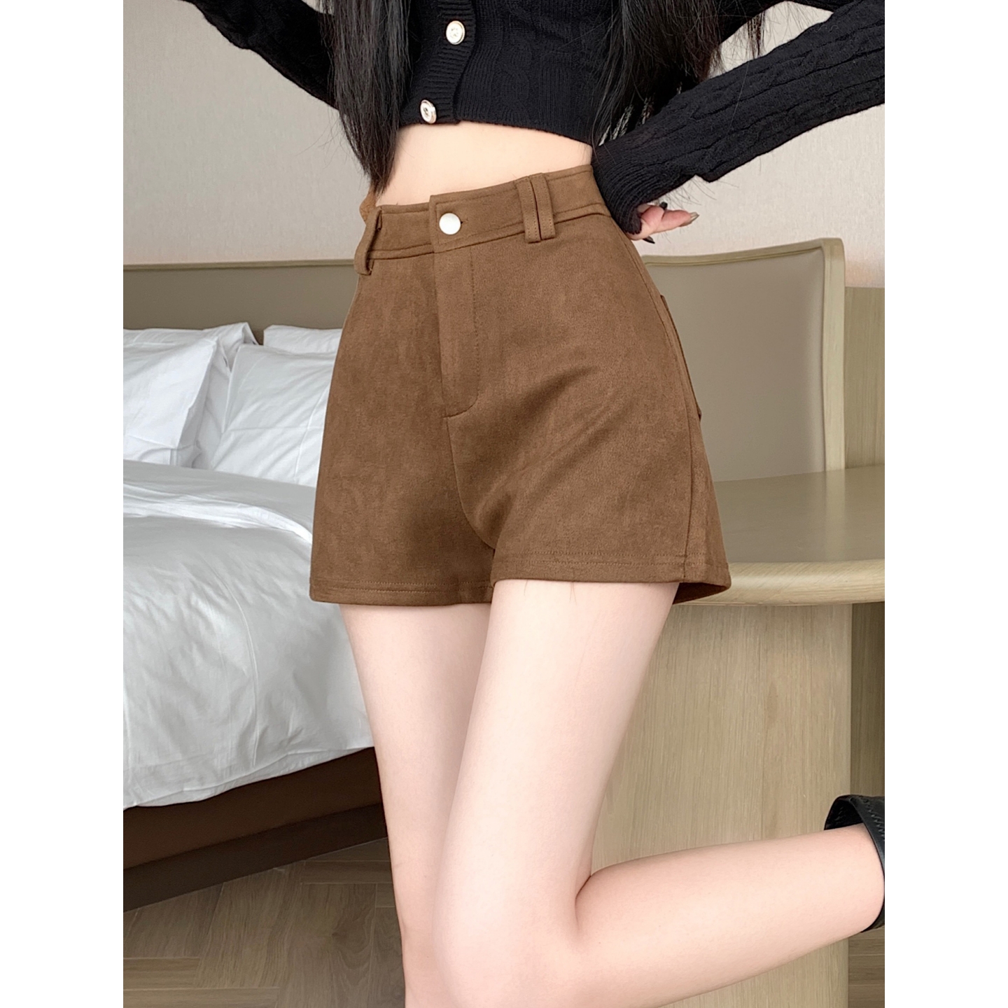2025秋外穿美式鹿皮绒棕色a字短裤女美拉德高腰显瘦打底包臀靴裤