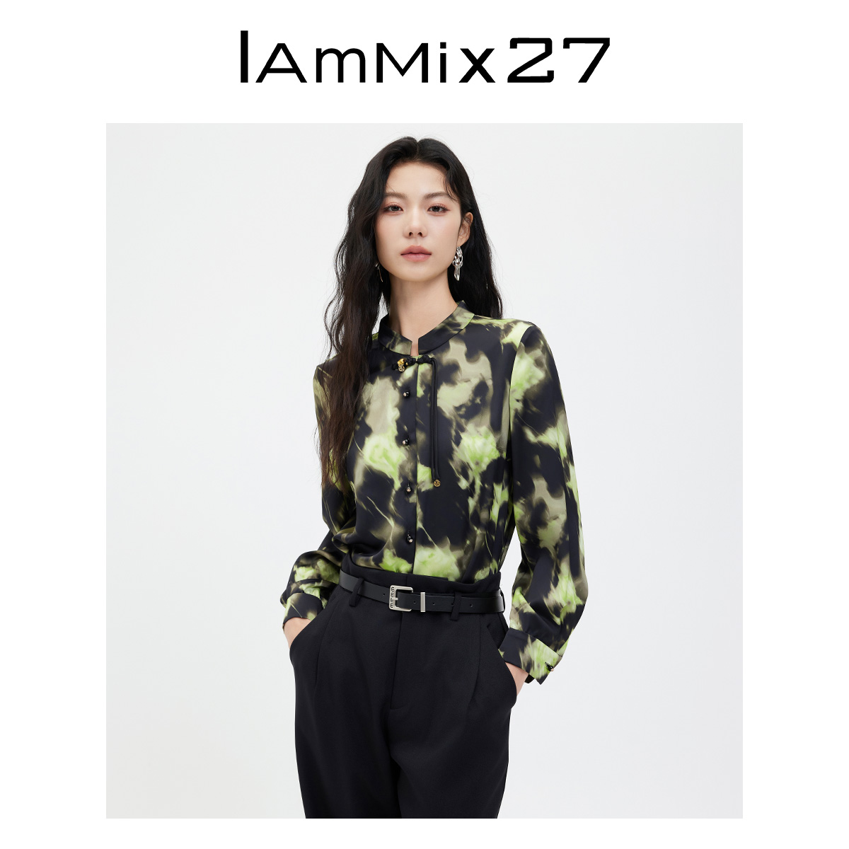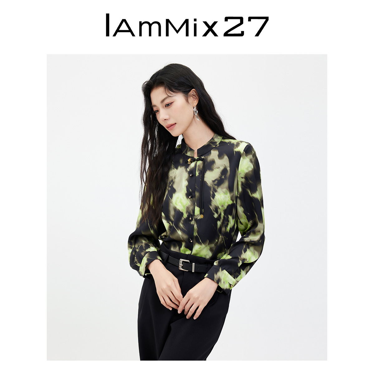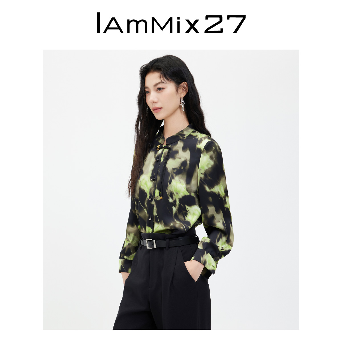 IAmMIX27中国风立领衬衫女宽松薄款水墨印花新中式盘扣长袖衬衣女