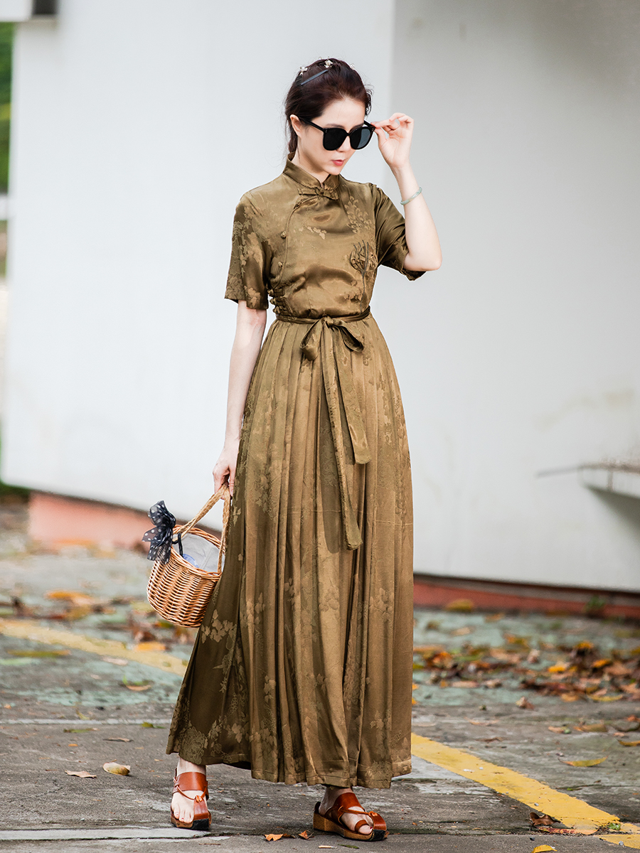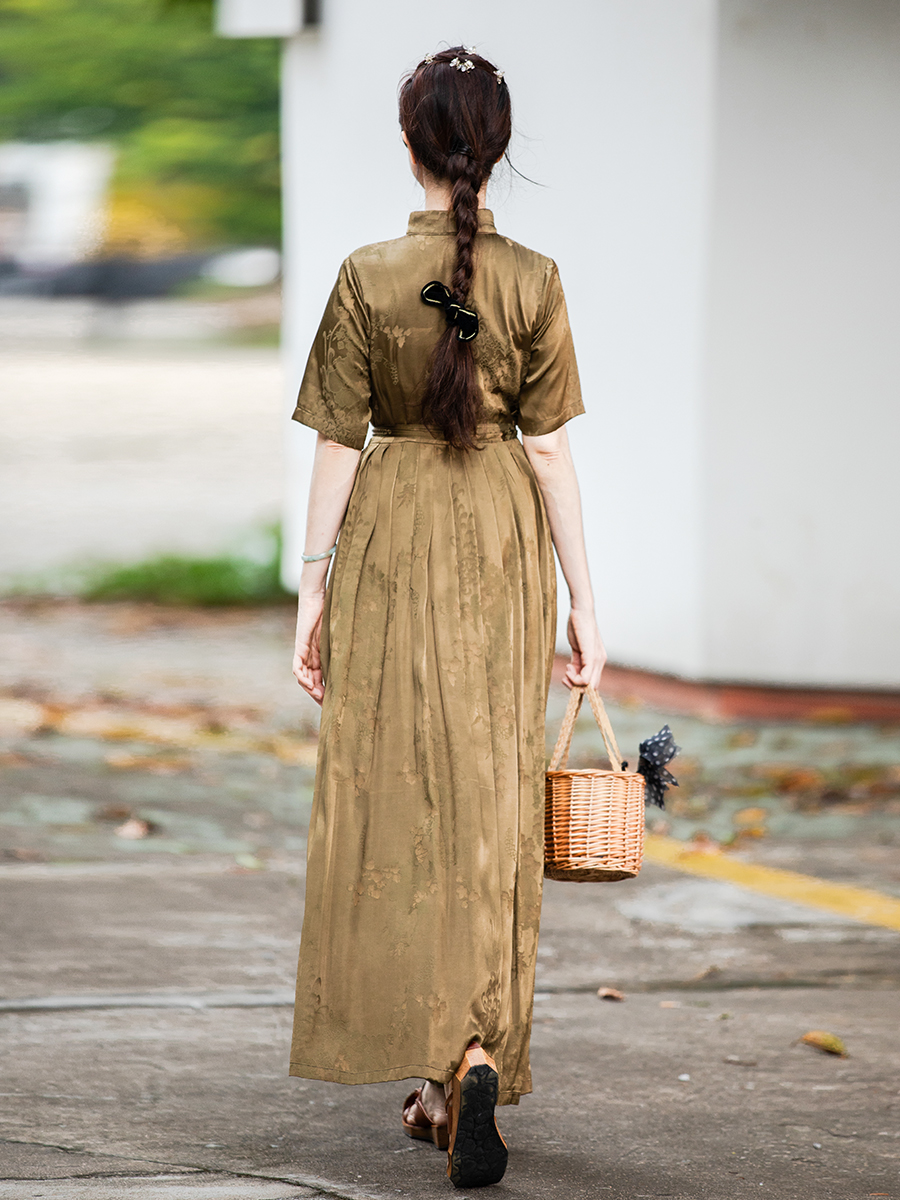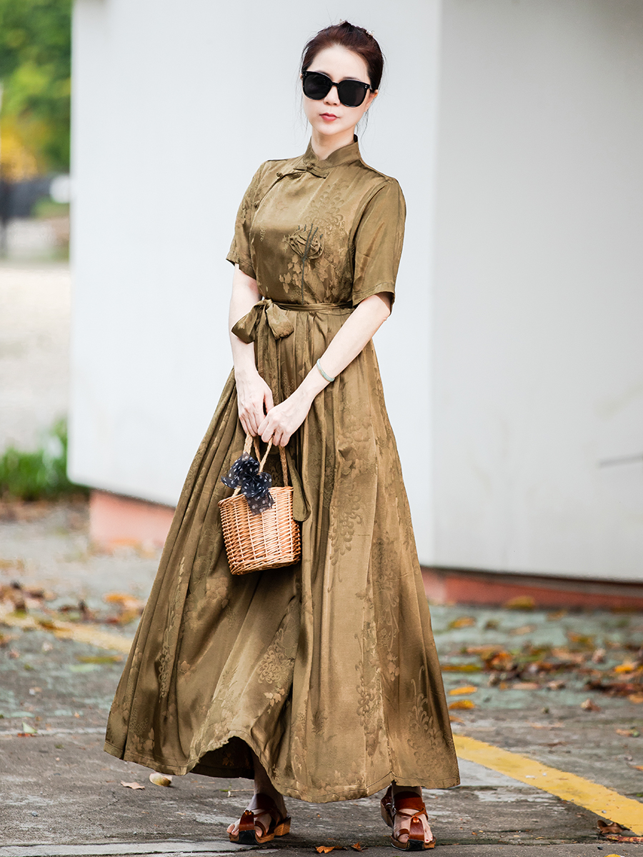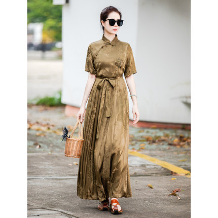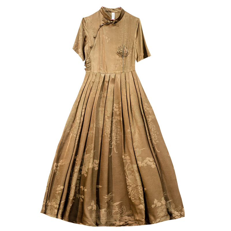 仙衣裾设计师原创复古连衣裙香槟金改良旗袍裙修身显瘦气质大摆裙