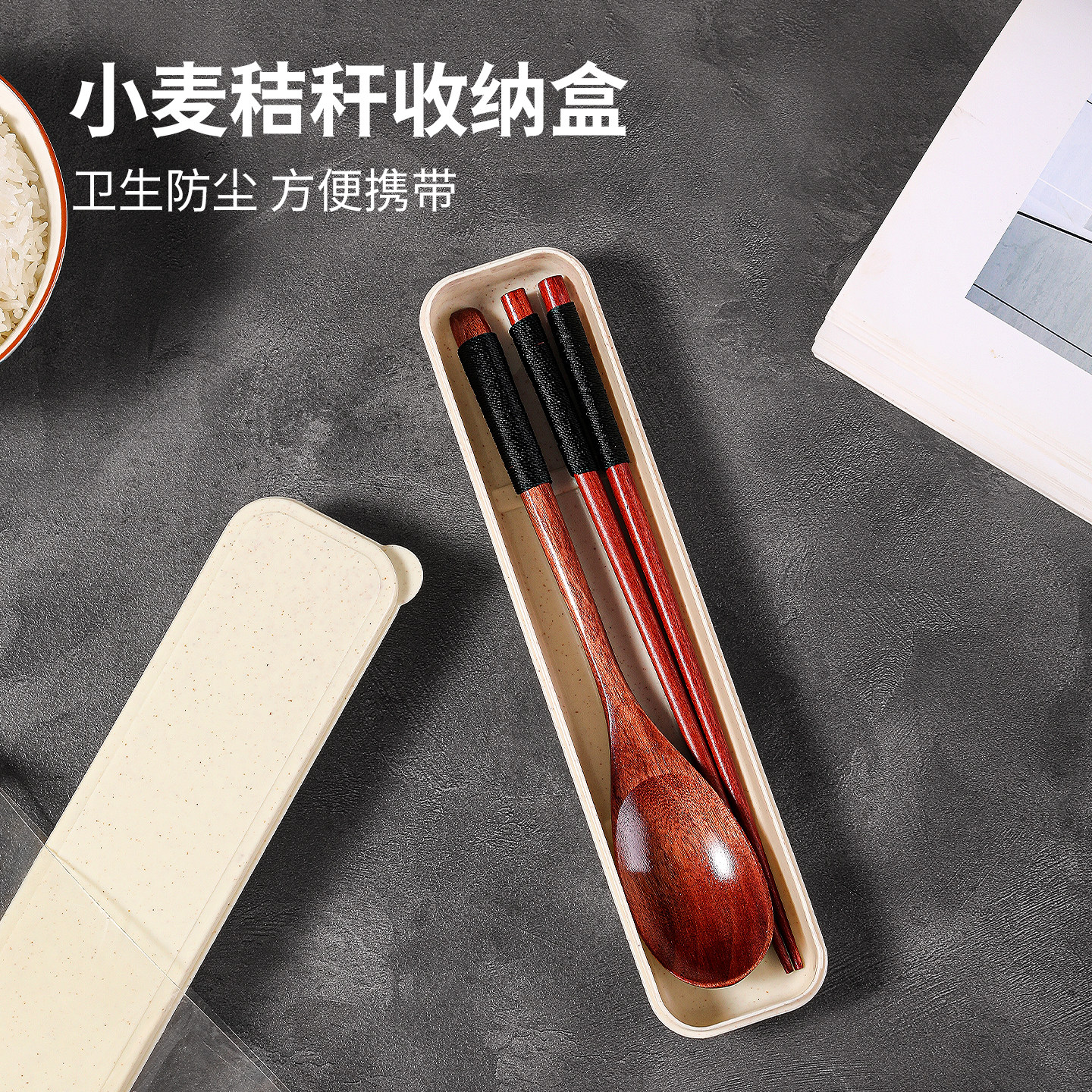 筷子勺子套装木质一人用便携式餐具三件套儿童学生专用外带收纳盒