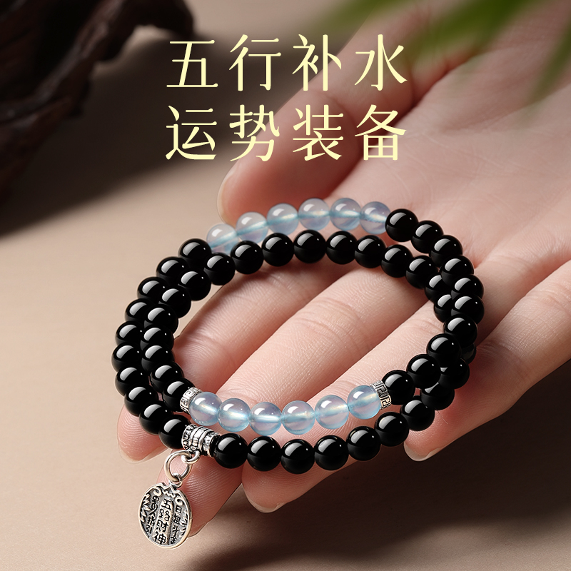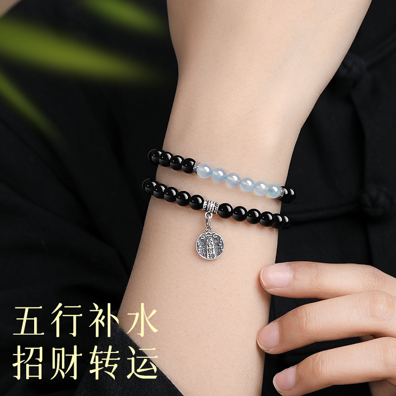 普陀山天然黑曜石海蓝宝手串女款补水招财水晶纯银情侣礼物手链男