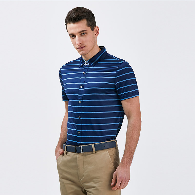 MENHARDUM/蔓哈顿男装夏季桑蚕丝开衫翻领短袖T恤真丝条纹短T