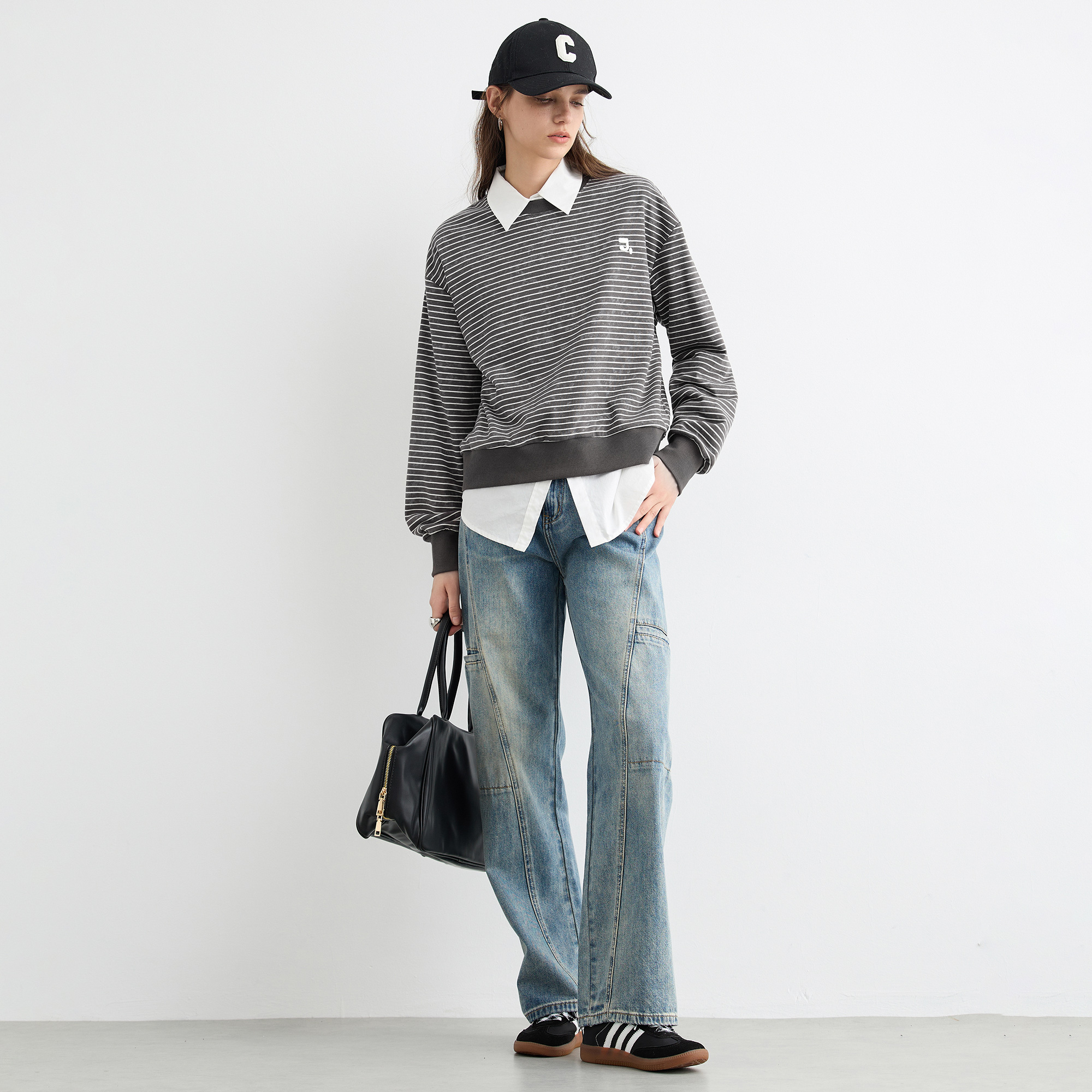 Basic House/百家好条纹圆领卫衣女2025秋季新款宽松长袖打底上衣