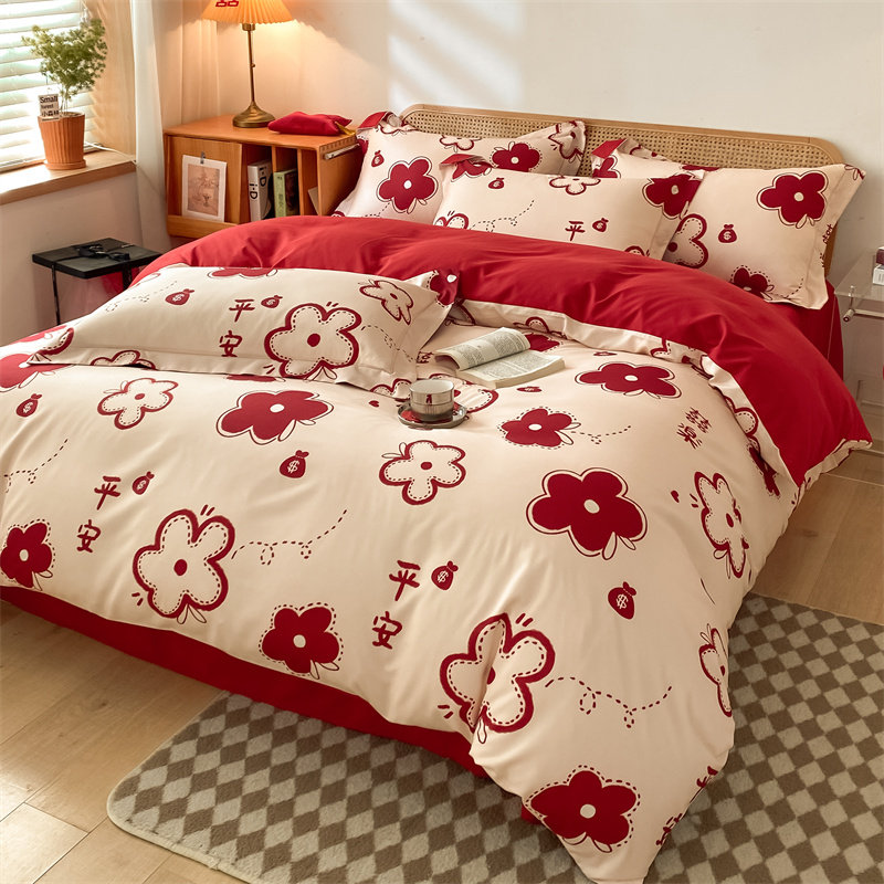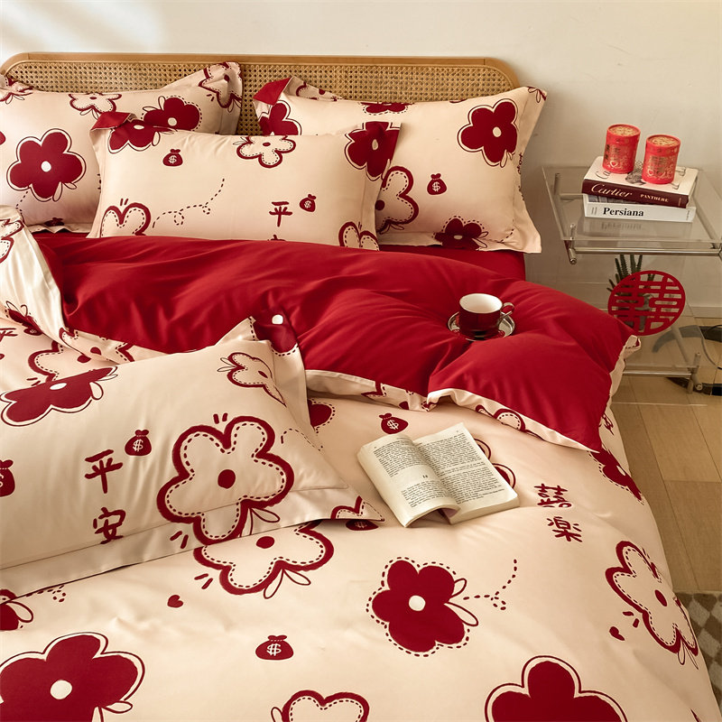 婚庆水洗棉喜庆四件套中式红牀单牀笠磨毛被套结婚房牀上用品
