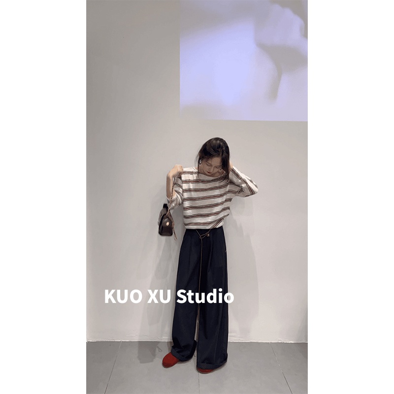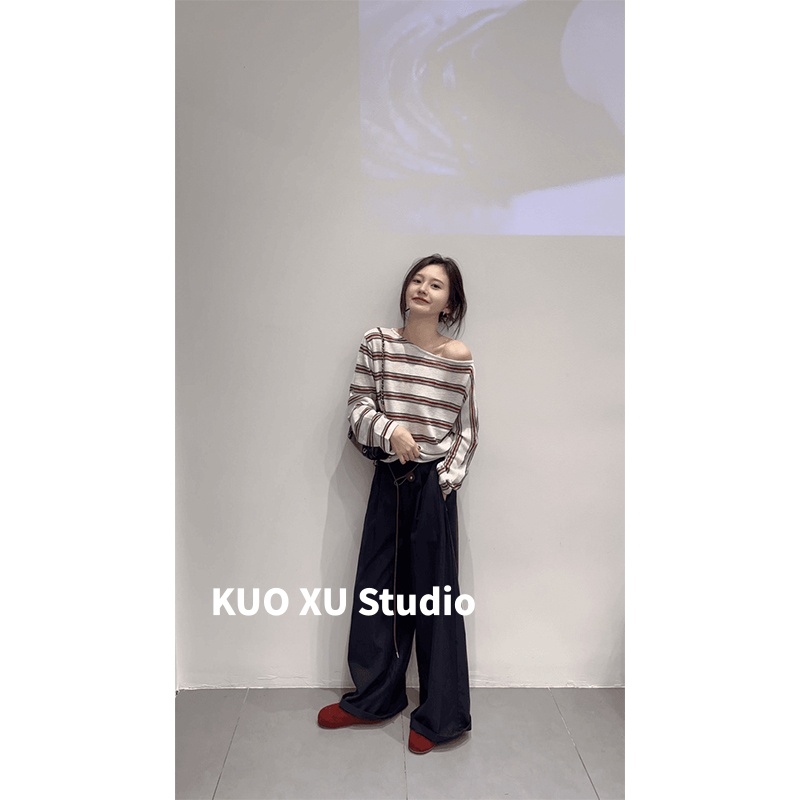 早秋穿搭慵懒斜肩复古条纹长袖T恤上衣高腰宽松垂感阔腿裤套装女