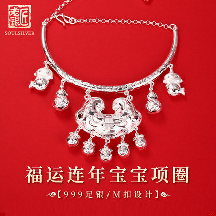 老银匠宝宝银项圈s999足银长命锁男女宝宝周岁儿童节礼物纯银项圈