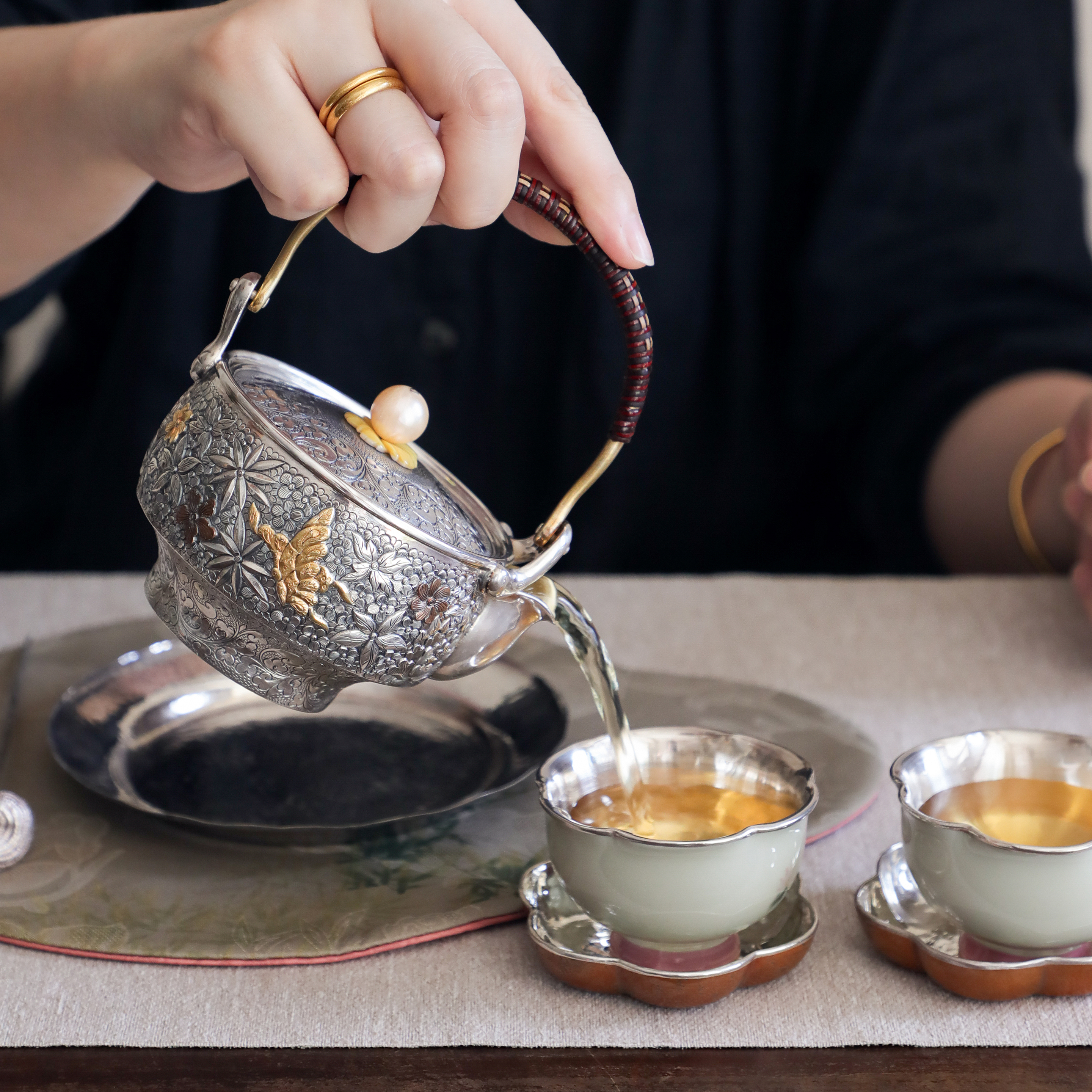纯银时代蝶戏繁花泡茶壶足银999