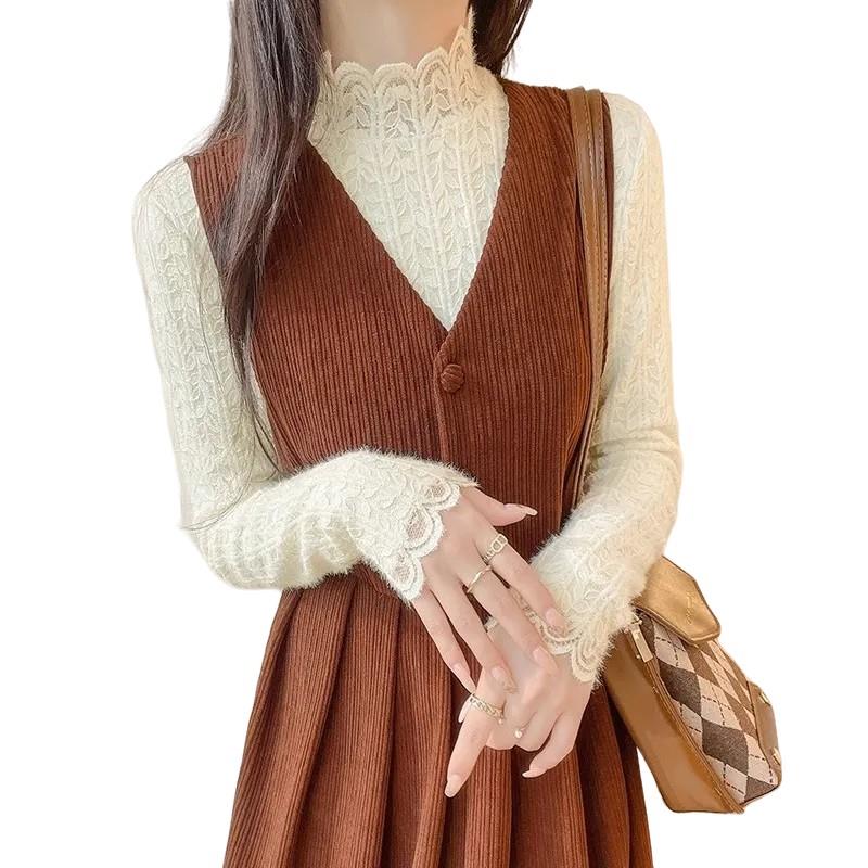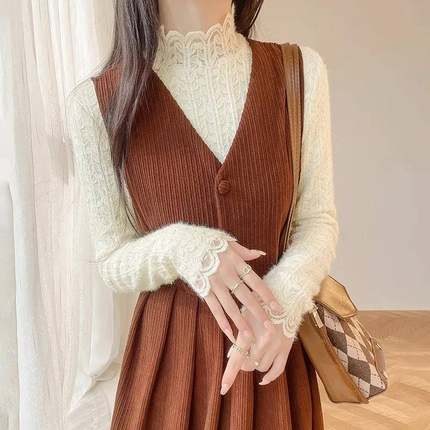 秋冬打底内搭加绒高领蕾丝衫女保暖长袖纱衣杏色网纱上衣显0929kz