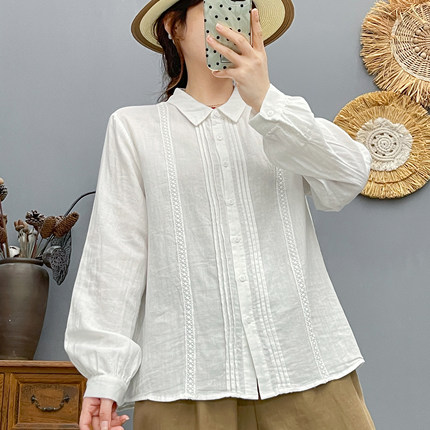 春秋新款纯棉文艺纯色拼接花边翻领衬衫长袖宽松百搭显瘦衬衣女士