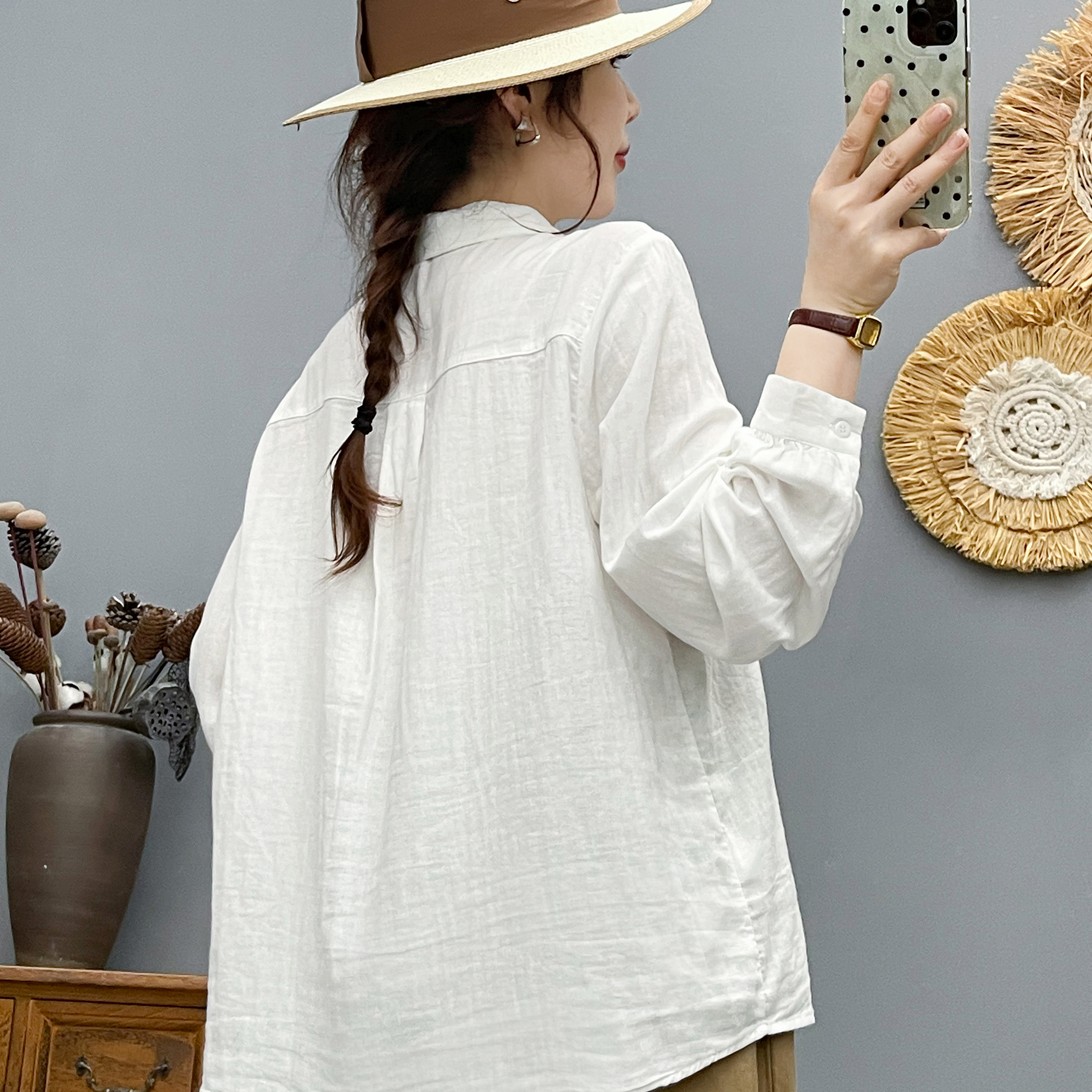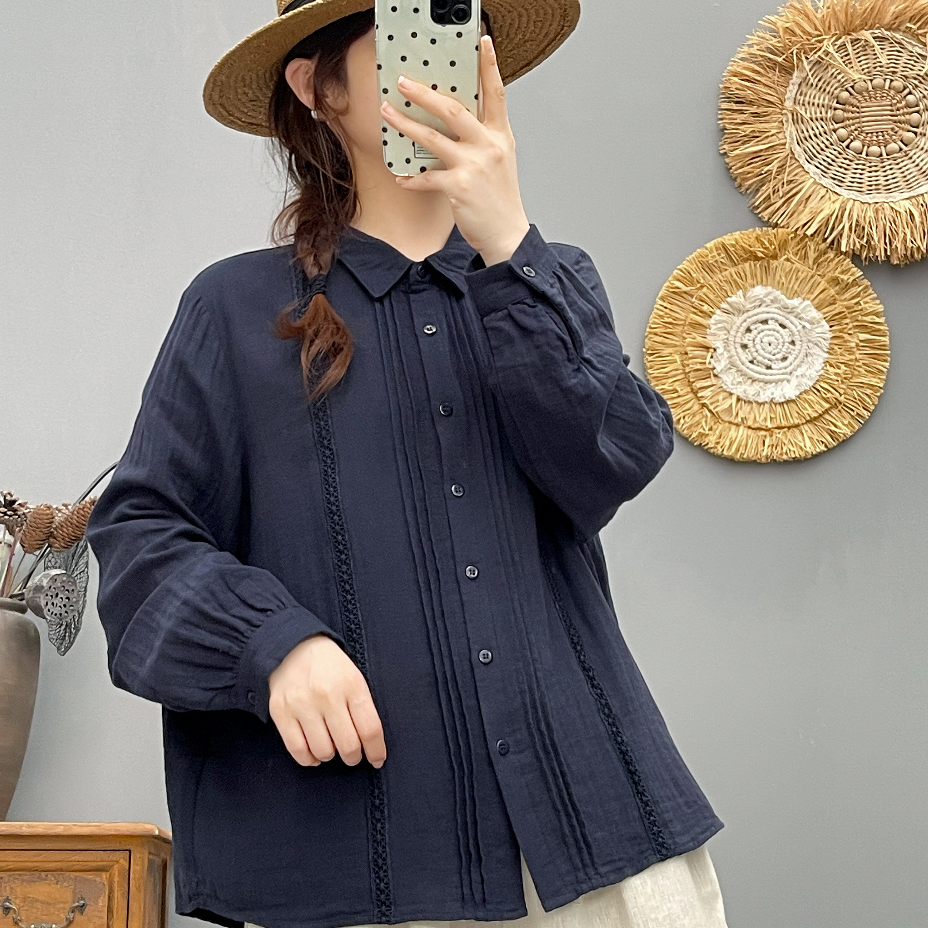 春秋新款纯棉文艺纯色拼接衬衫