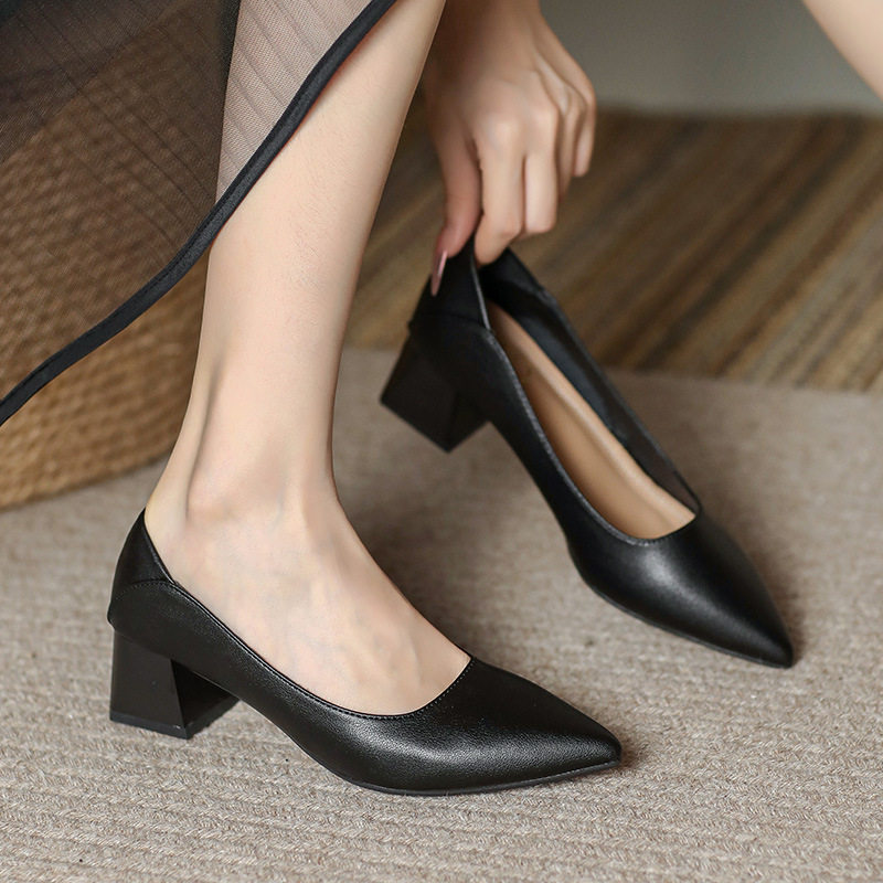 真皮尖头单鞋女高跟鞋一脚蹬通勤