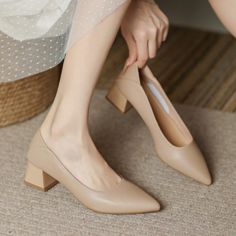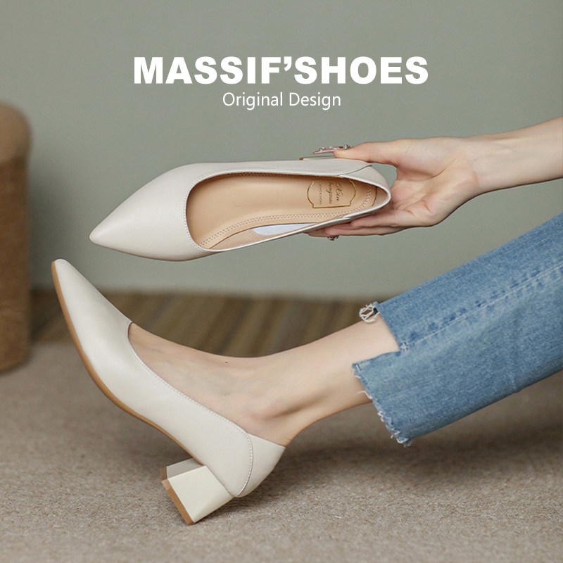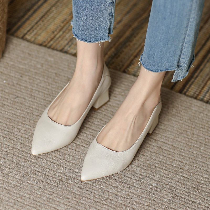 真皮尖头单鞋女2025新款浅口粗跟高跟鞋一脚蹬白色通勤工作奶奶鞋