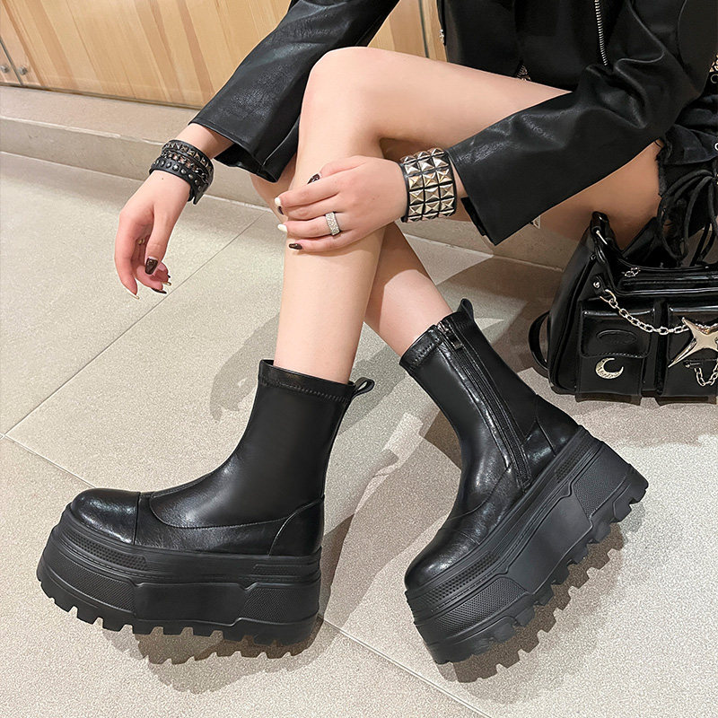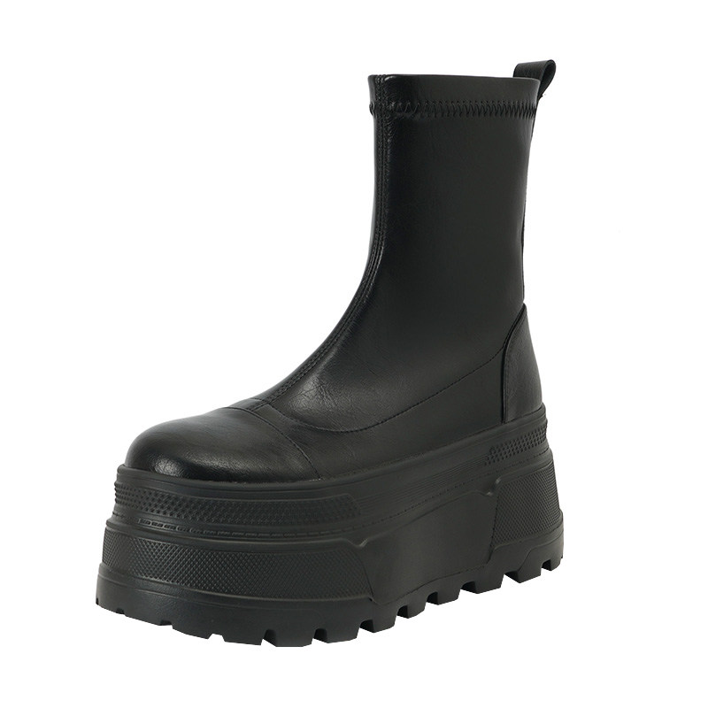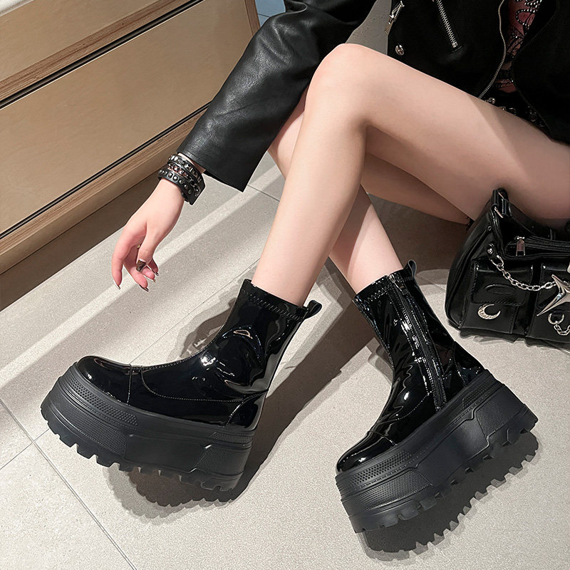厚底松糕弹力瘦瘦靴女秋冬新款高跟百搭圆头马丁靴小个子漆皮短靴