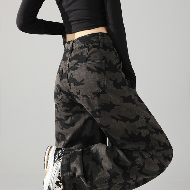 美式迷彩弯刀阔腿牛仔裤女春秋季新款2025休闲高腰工装窄版直通裤