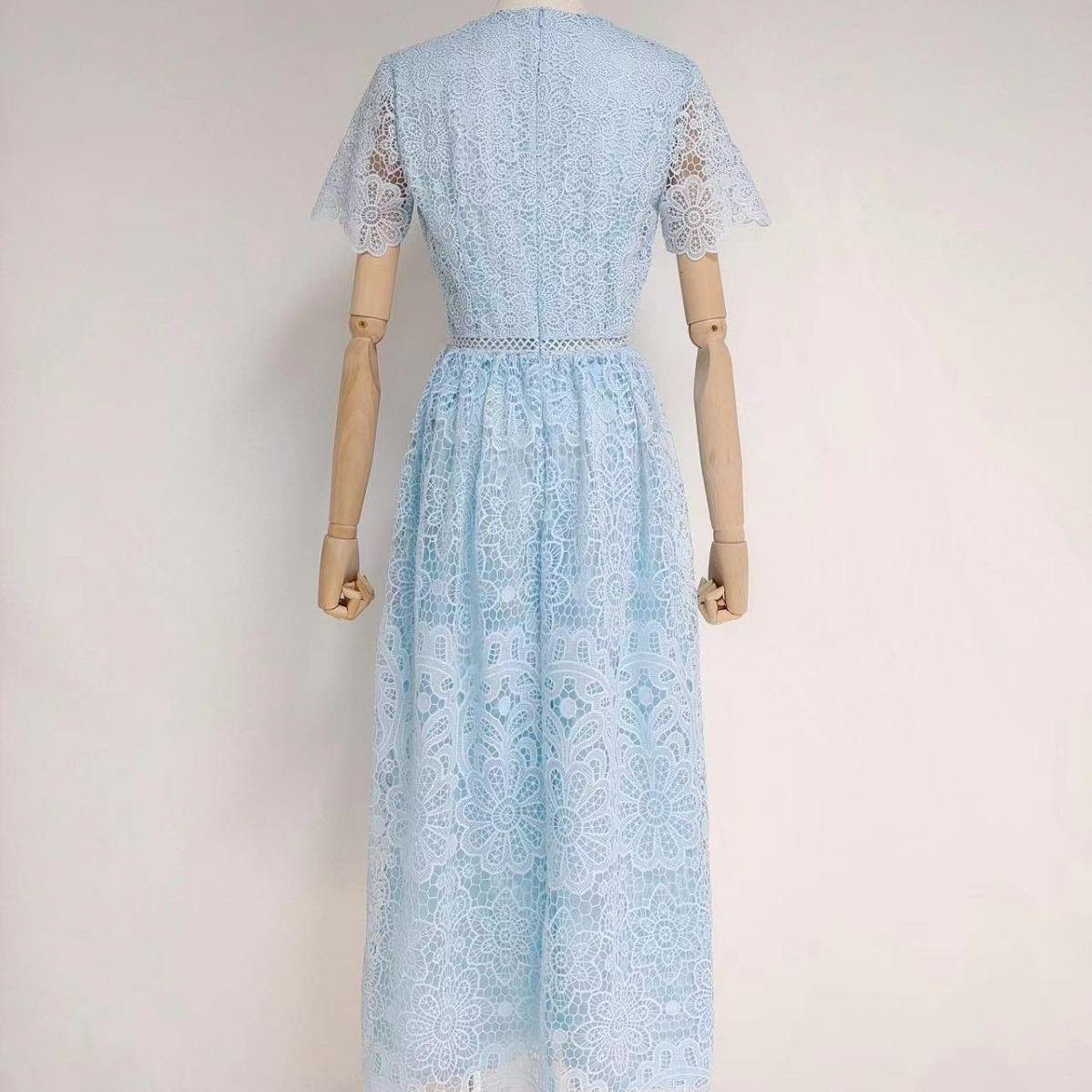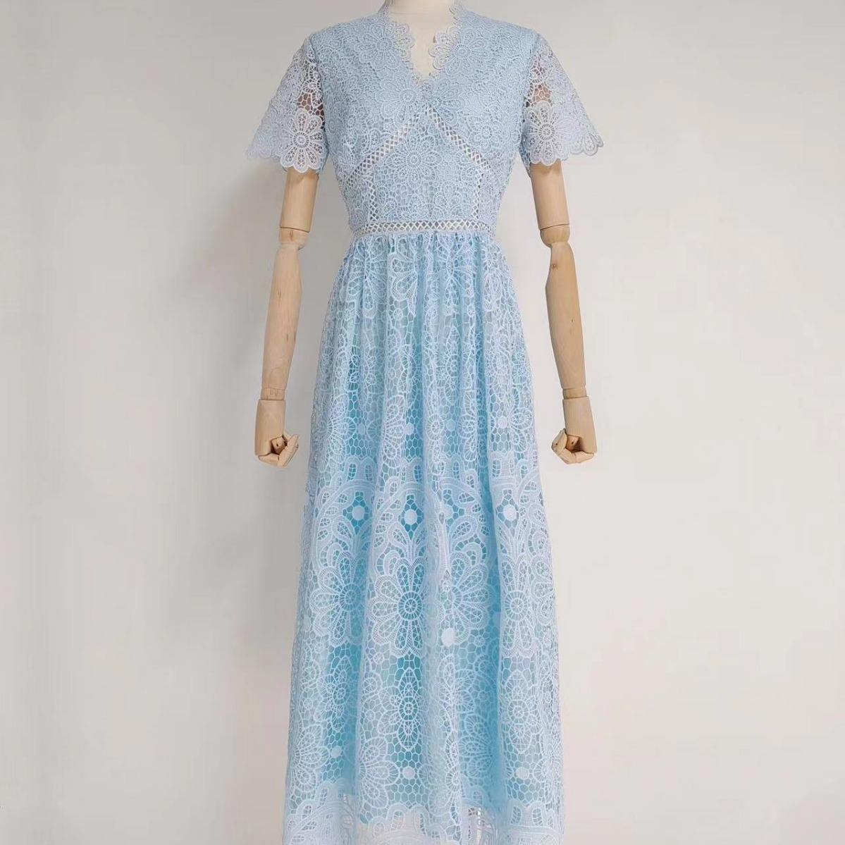 V领短袖水溶花镂空拼接收腰大摆时尚长裙连衣裙夏季新常规袖广州