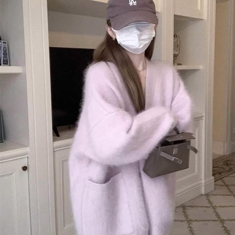 温柔软糯水貂绒中长款开衫毛衣女外套春秋冬宽松慵懒风v领针织衫