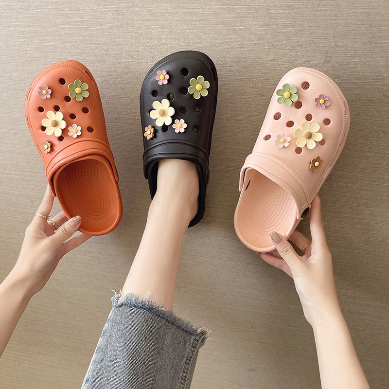 花朵洞洞鞋女外穿防滑包头半拖鞋女新款时尚平底沙滩海边凉拖鞋夏
