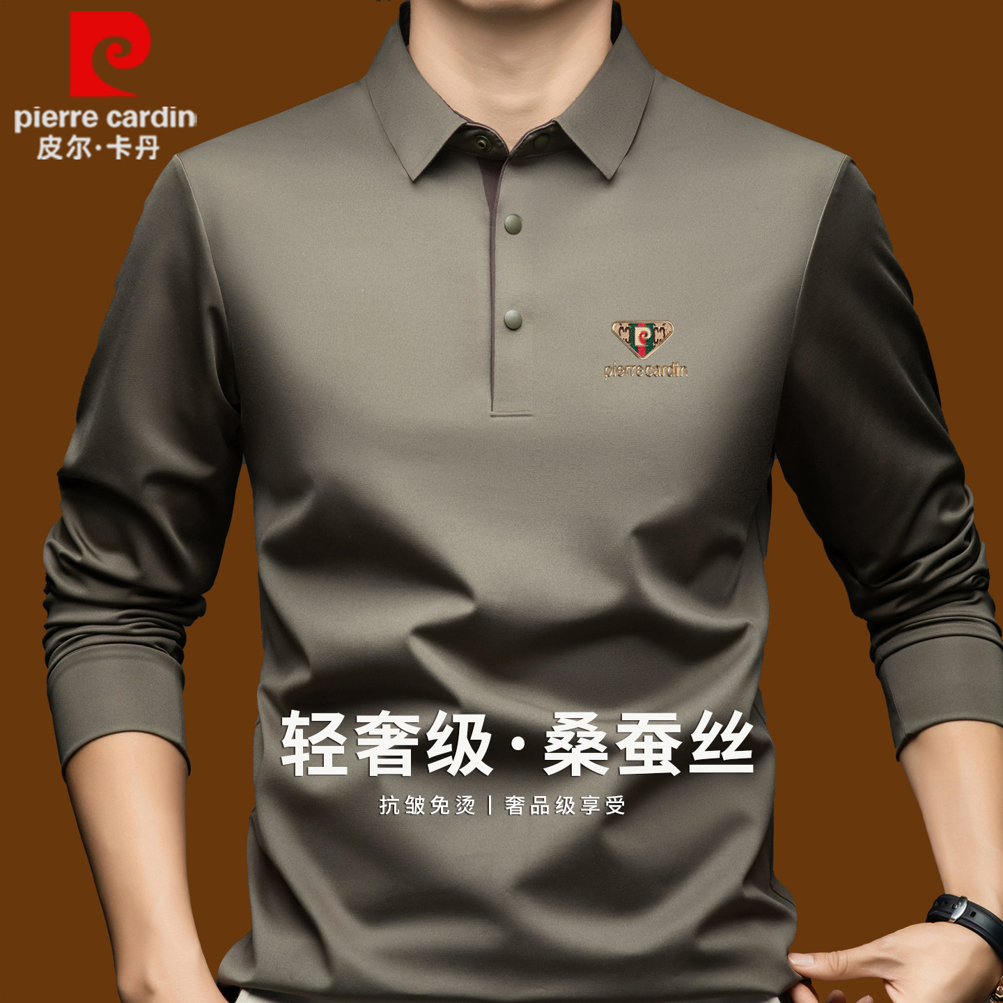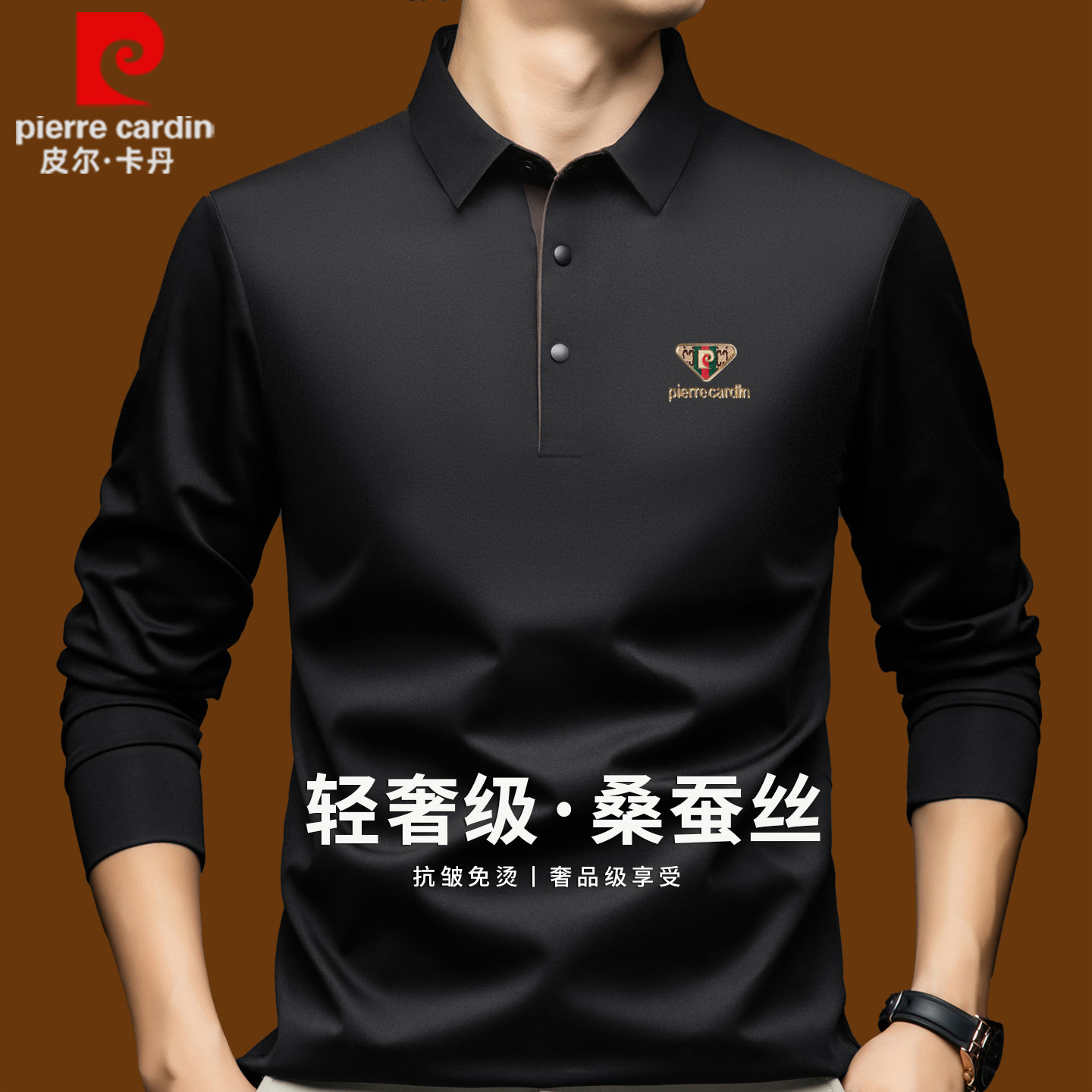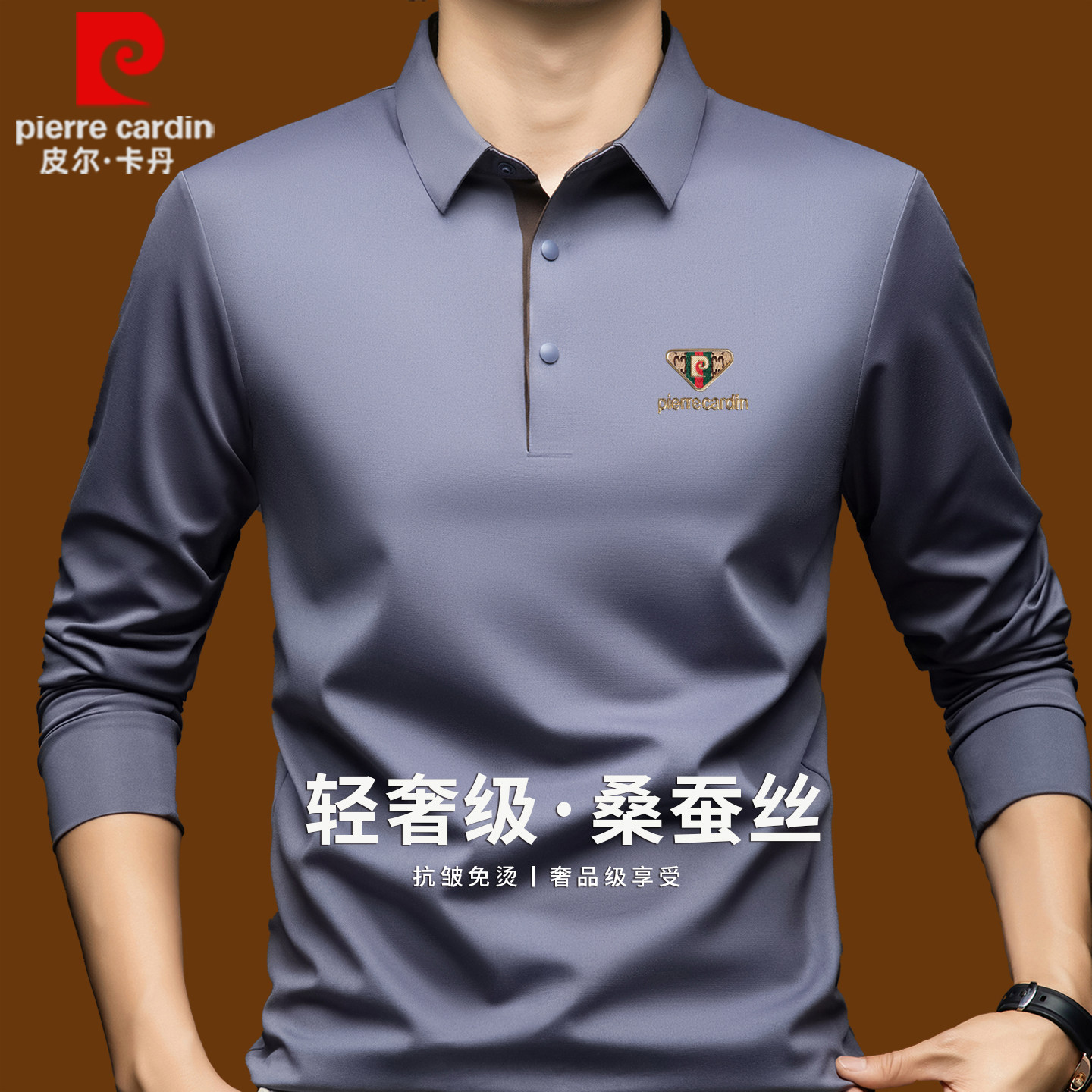 正品皮尔卡丹高端桑蚕丝长袖t恤男士秋季无痕翻领商务休闲polo衫