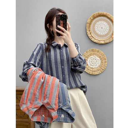 秋季薄款双层棉纱长袖衬衫女方领条纹休闲纯棉上衣复古宽松衬衣女