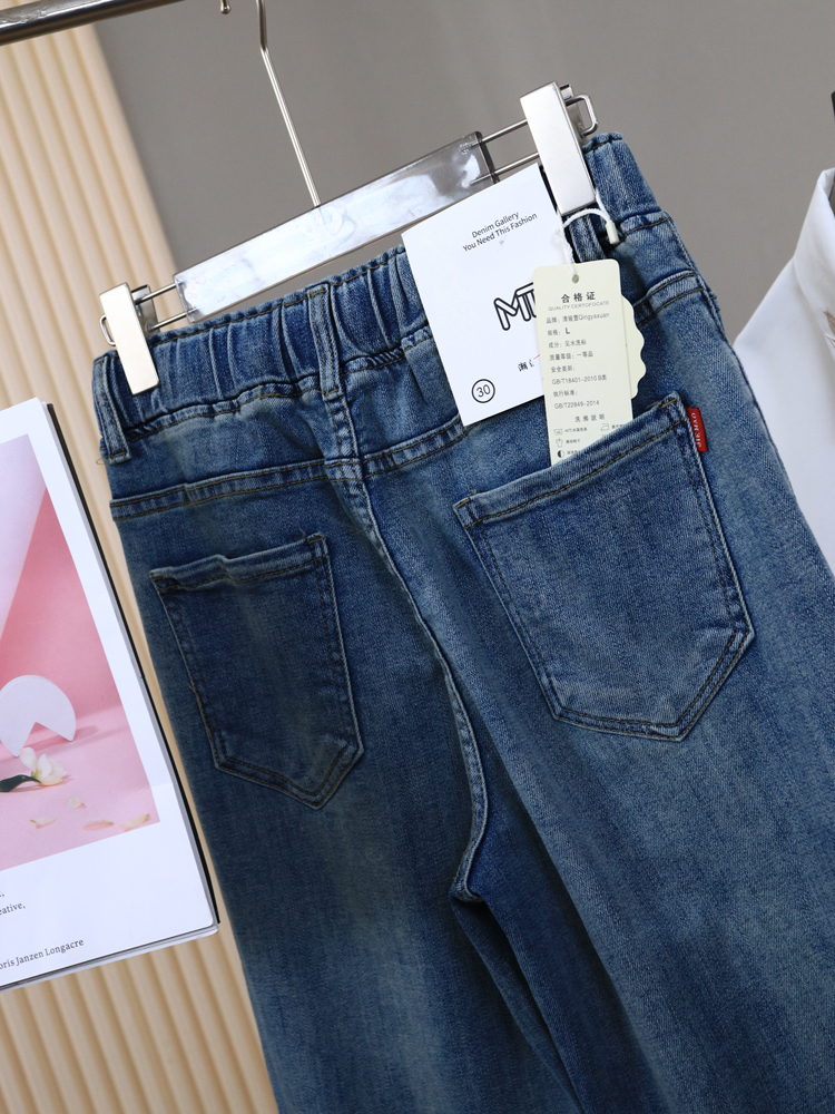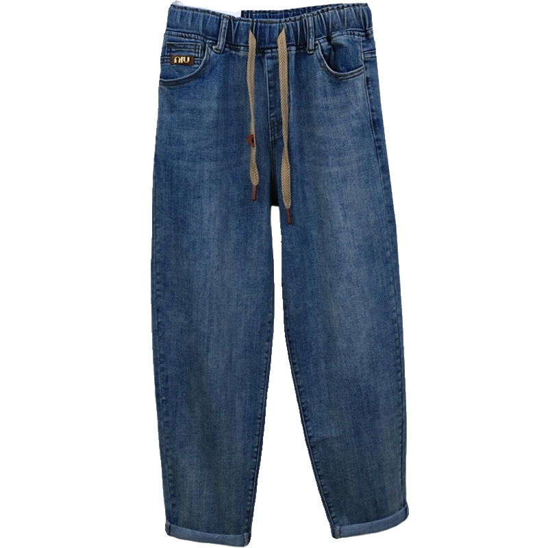 蓝色系带松紧腰翻边宽松阔腿老爹裤减龄新款百搭长裤女牛仔裤N669