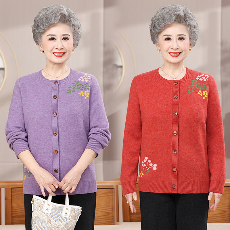奶奶装春秋红色针织开衫老大码年人圆领绣花毛衣外套妈妈宽松上衣