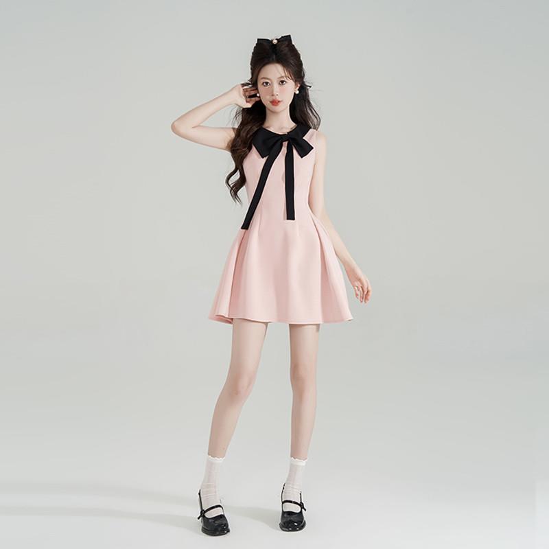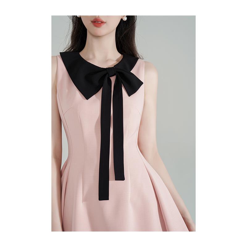 小香风粉色蝴蝶结挂脖连衣裙女夏季法式收腰千金风荷叶边字裙子