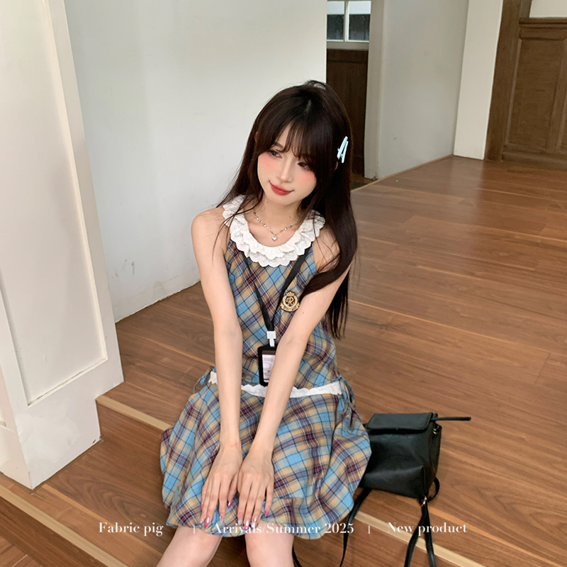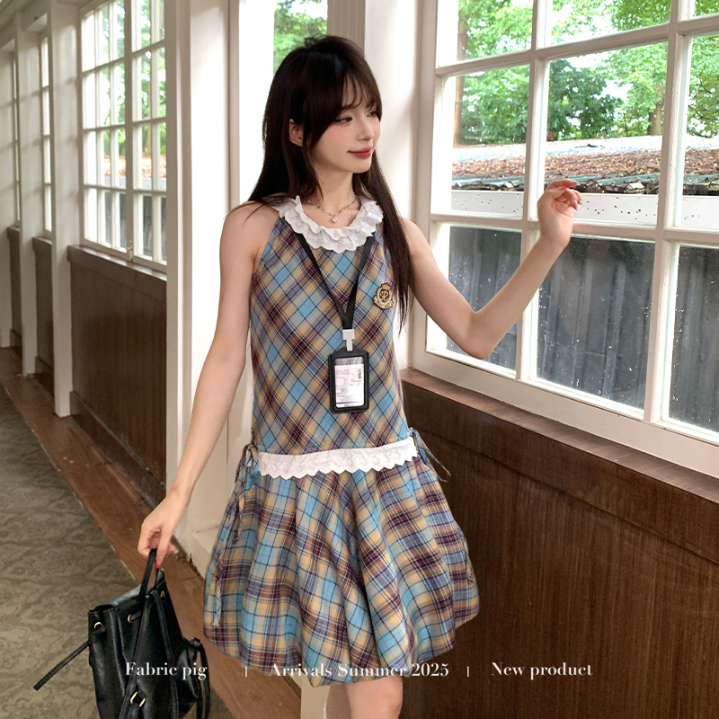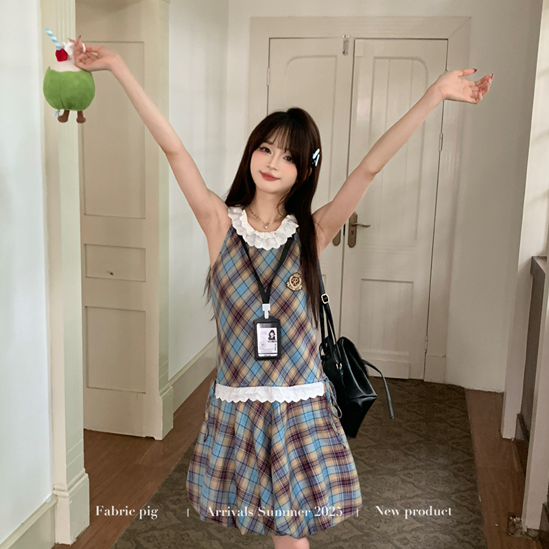 织物猪 高校法则 学院风复古格纹无袖连衣裙女夏季背心花苞短裙子
