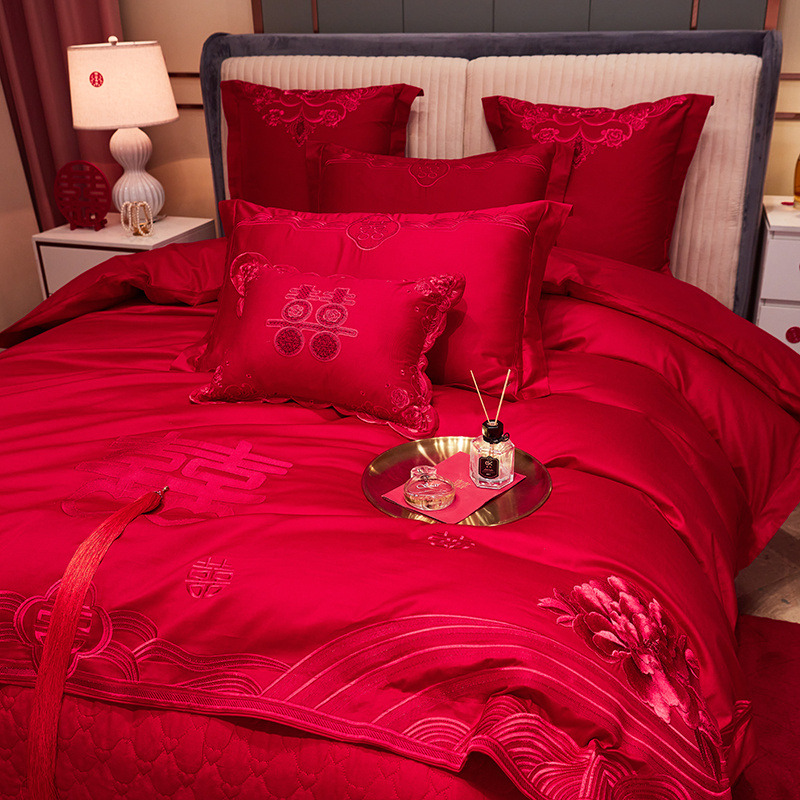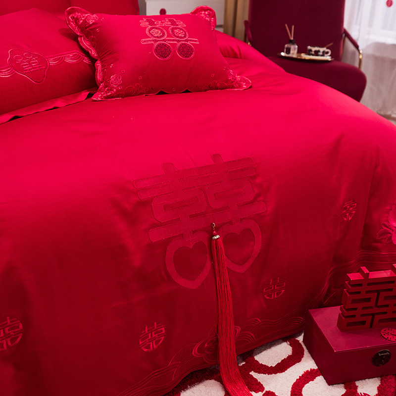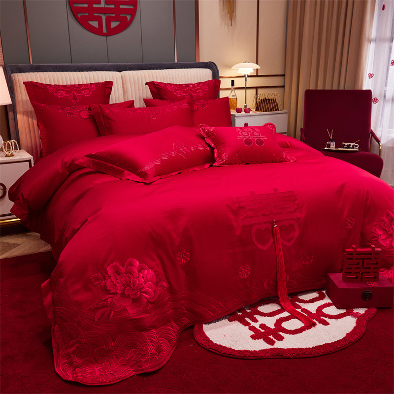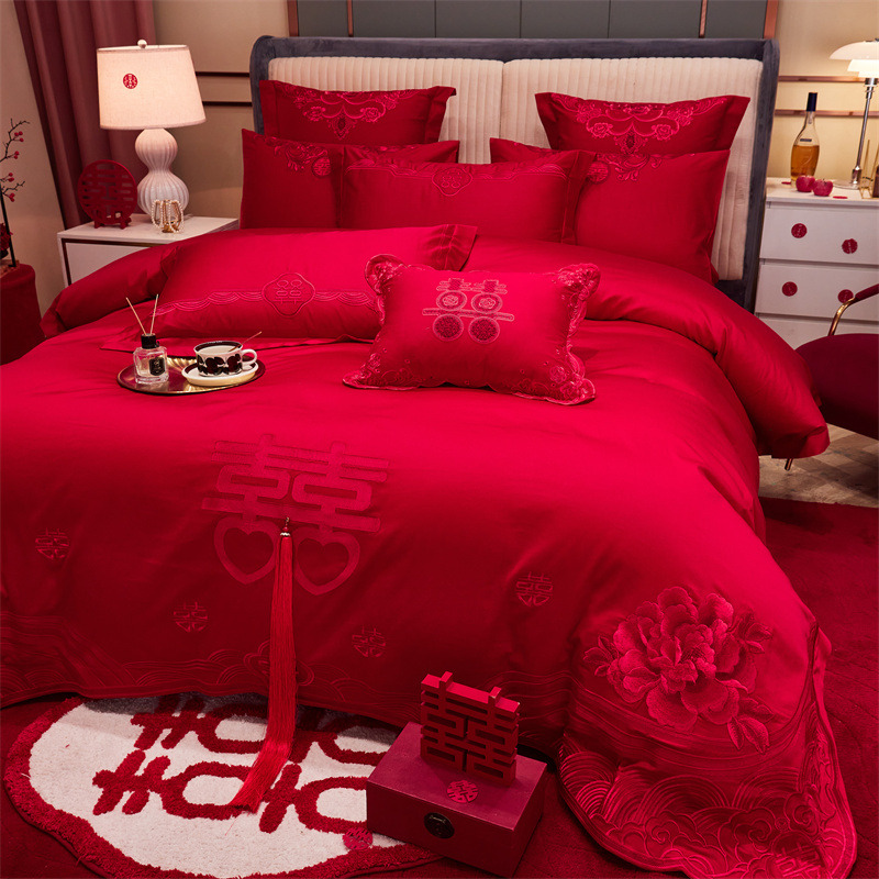 120支长绒棉婚庆大红刺绣四件套