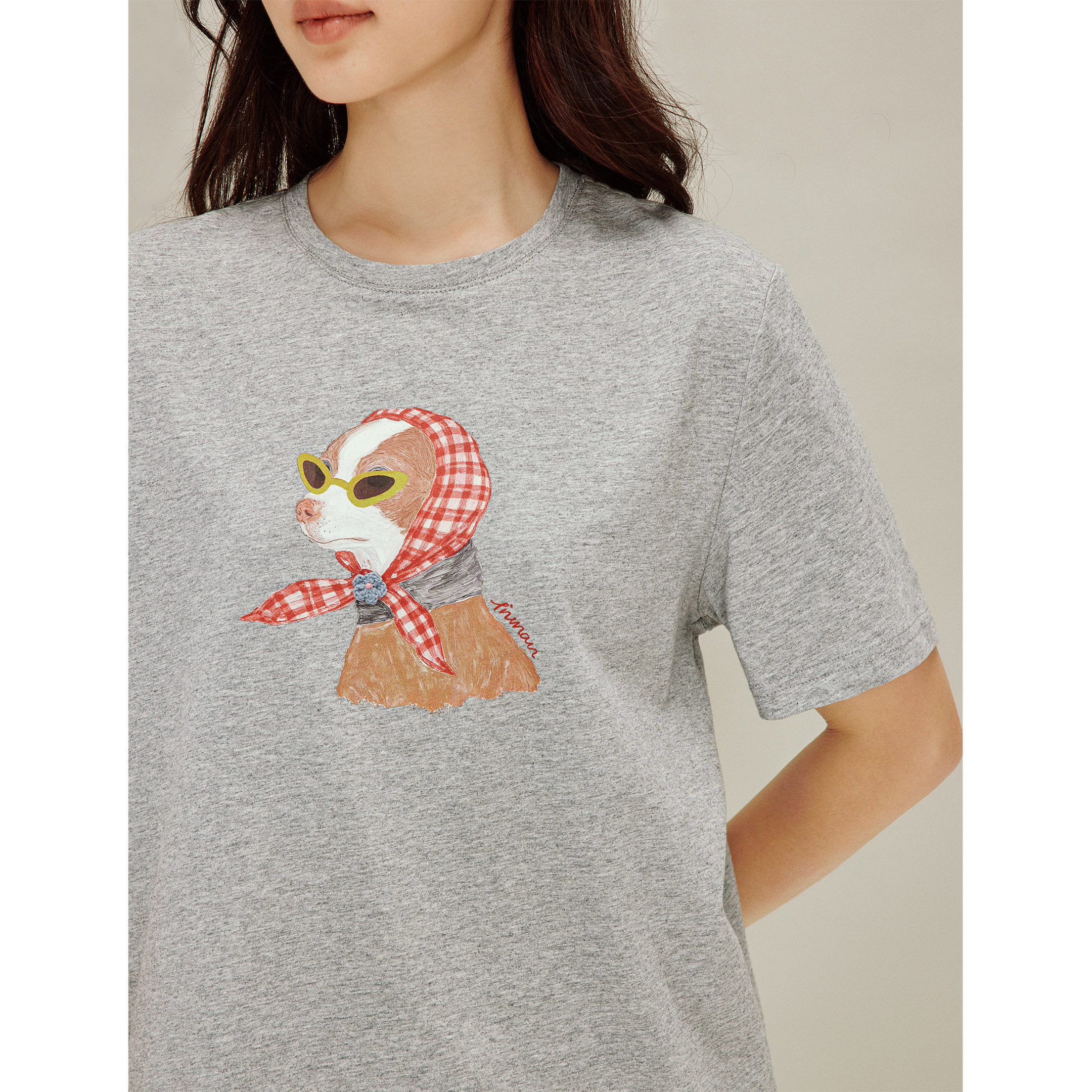茵曼花巾萌宠印花100棉T恤2026春季女装新款休闲百搭显瘦短袖上衣
