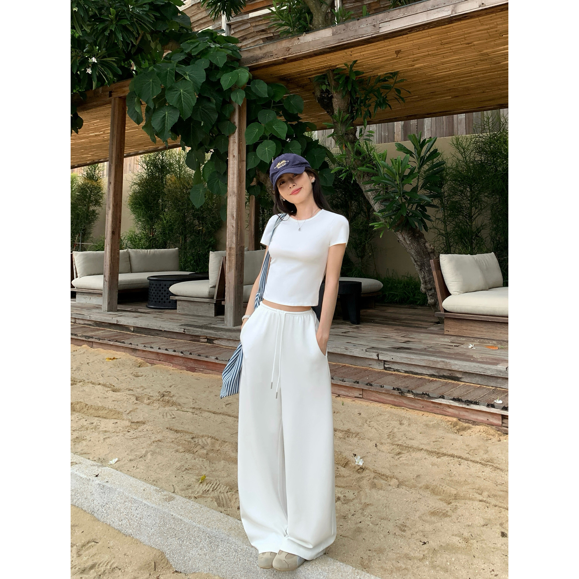 pusumede 悠闲夏日 圆领短袖T恤女针织上衣宽松休闲阔腿长裤套装
