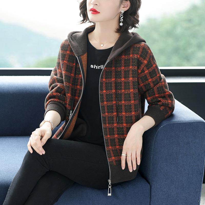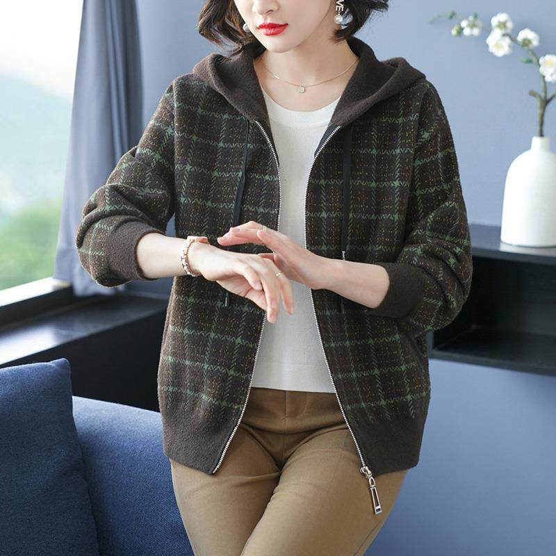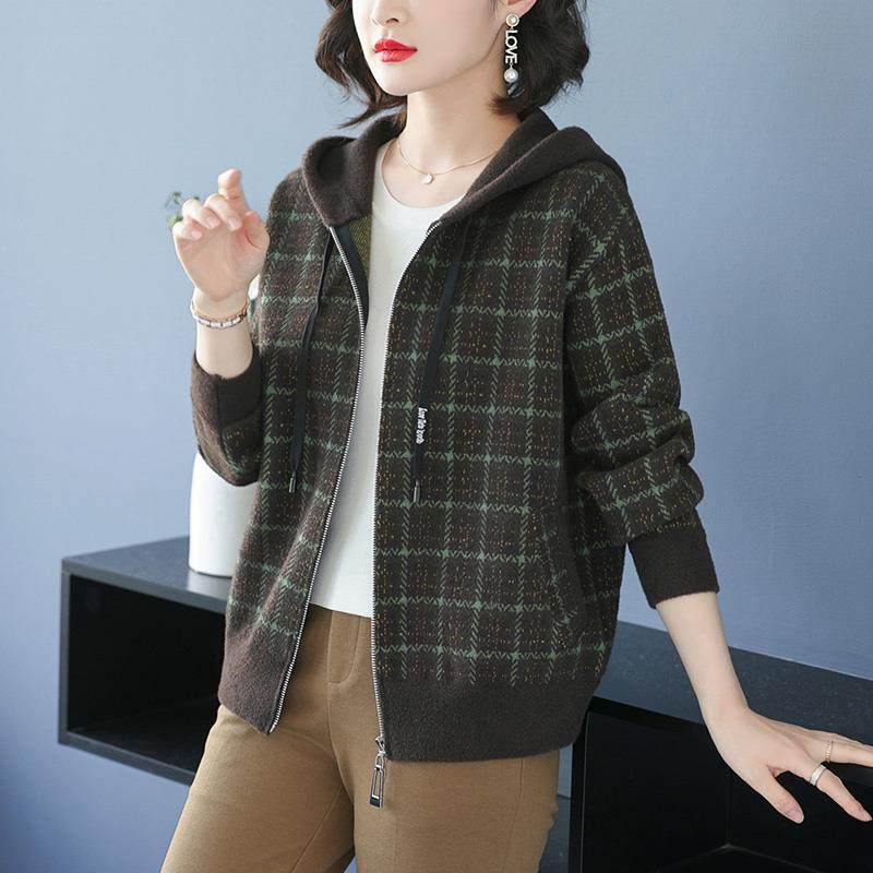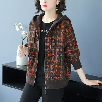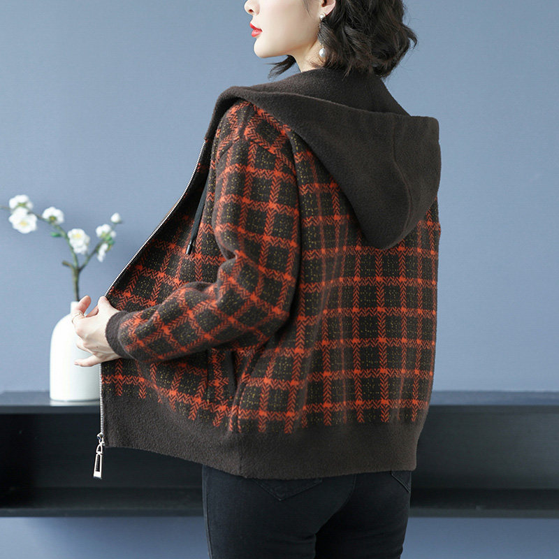 女士格子连帽短外套秋季2024年新款秋冬中年妈妈针织开衫上衣春秋