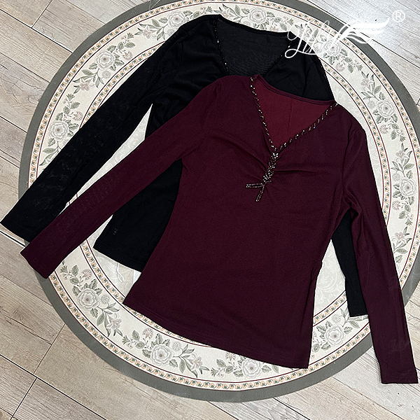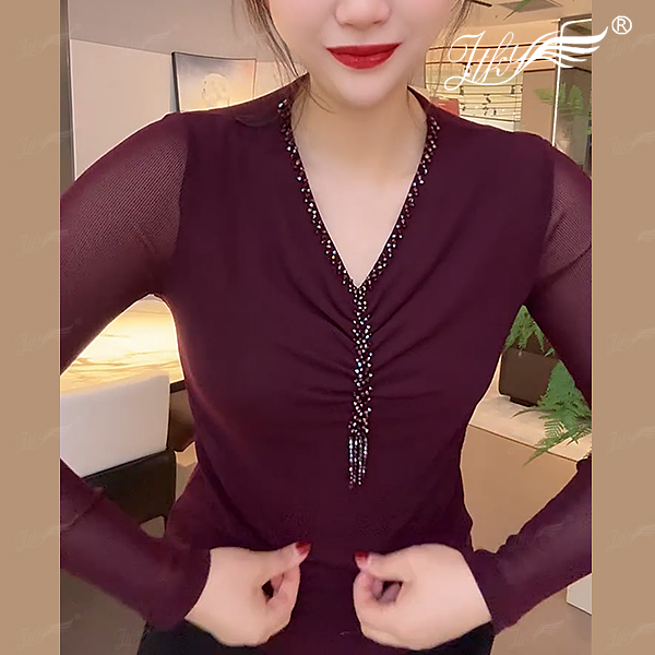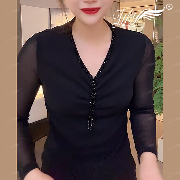 春秋新款修身显瘦高弹网纱打底衫优雅洋气长袖前捏褶串珠设计上衣