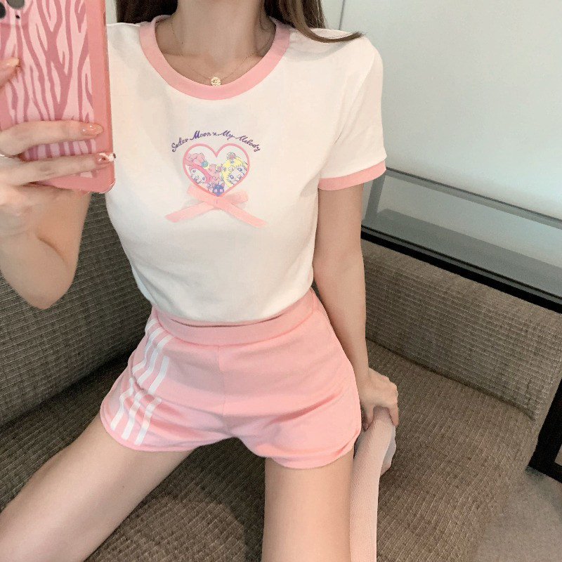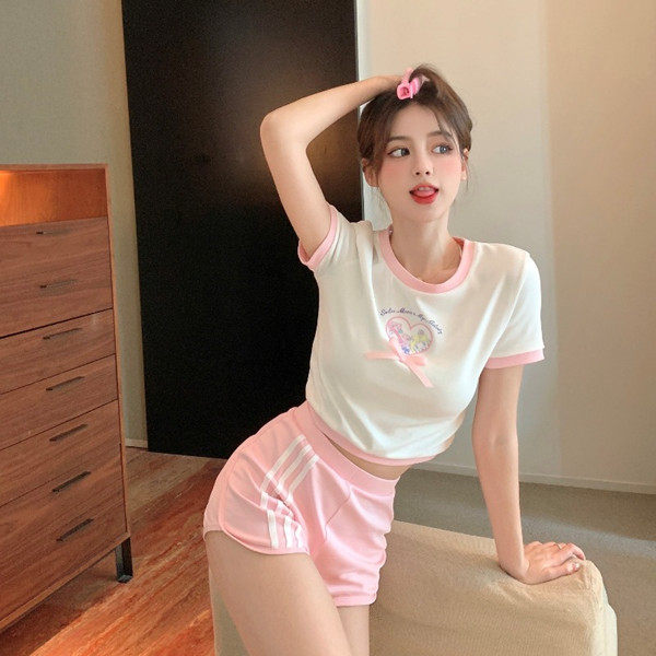 撞色T恤女蝴蝶结纯欲短款甜美辣妹紧身露脐高腰短袖上衣两件套装