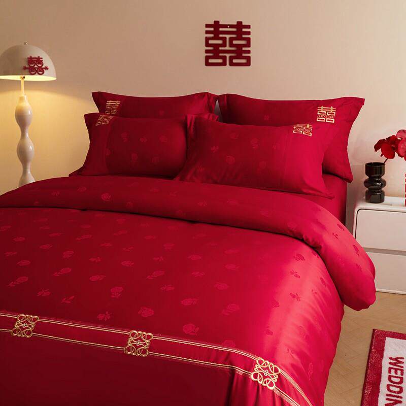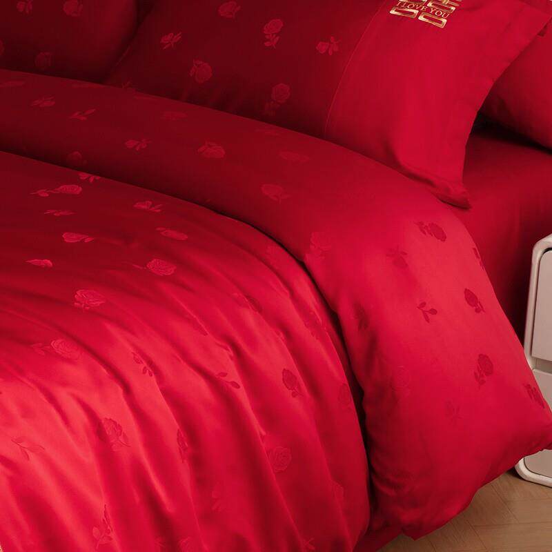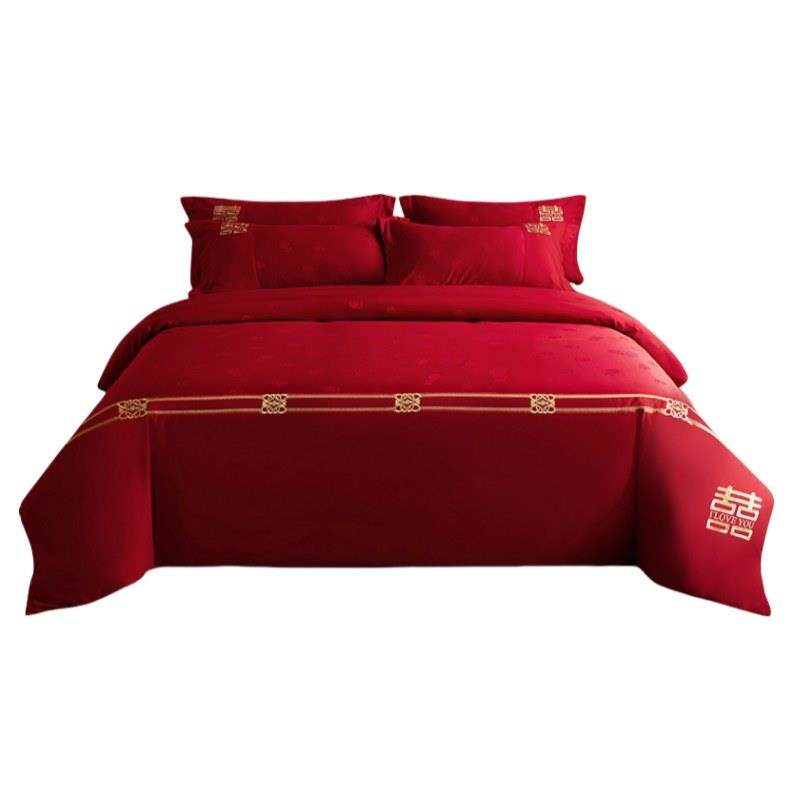 婚庆四件组大红色结婚床上用品床单款床笠款被套四件套透气抗菌