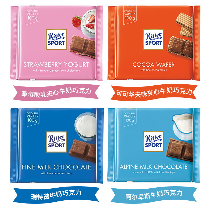 德国RitterSport瑞特斯波德瑞特滋牛奶黑巧克力夹心排块零食3块装