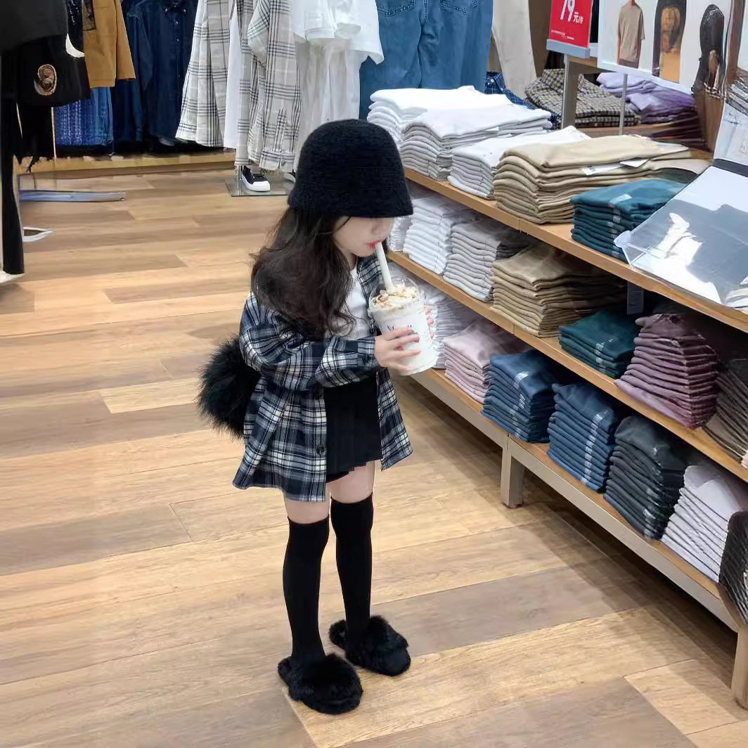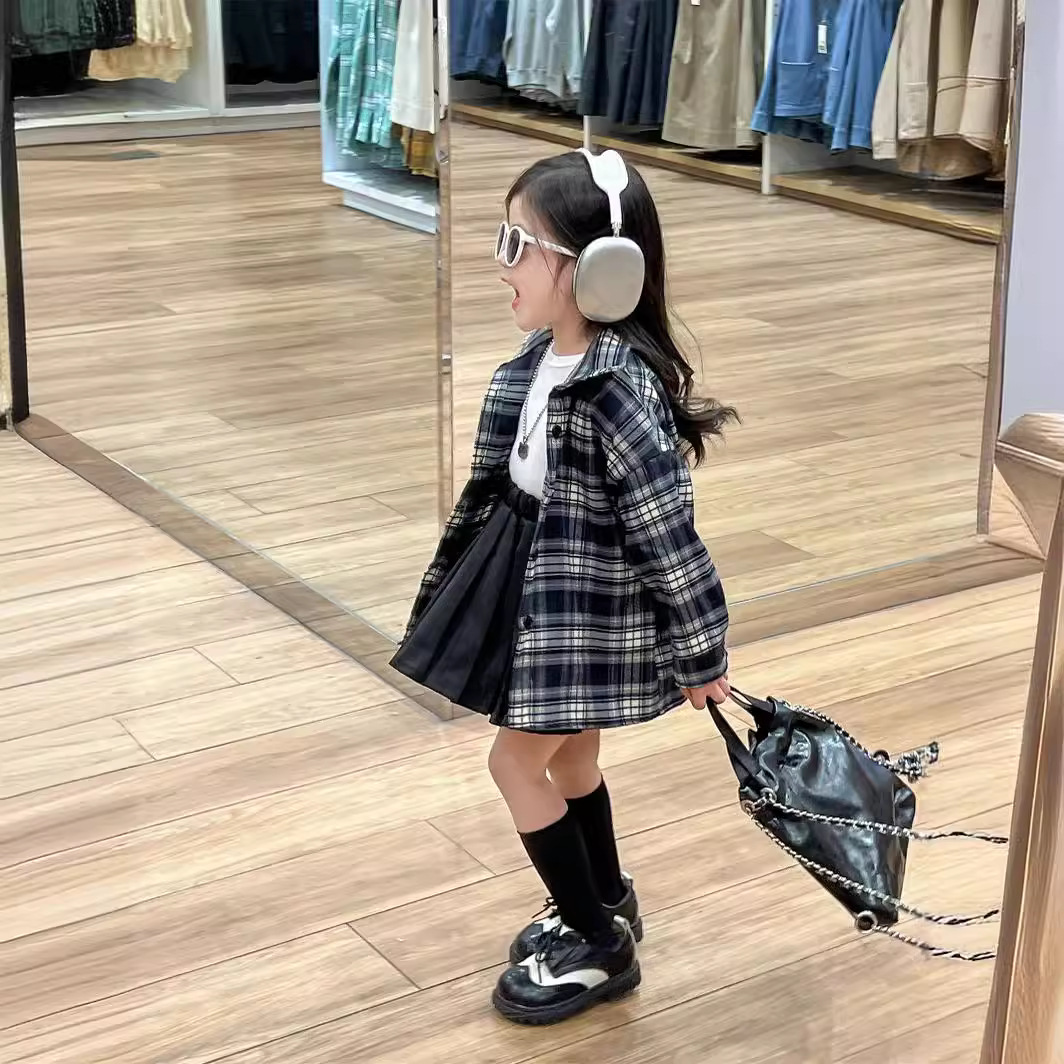 儿童衬衫秋装套装2025韩版新款经典藏蓝格子长袖上衣百褶裙三件套
