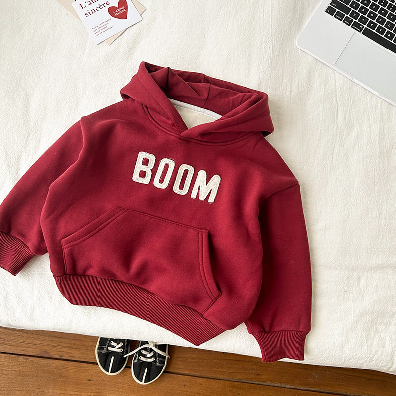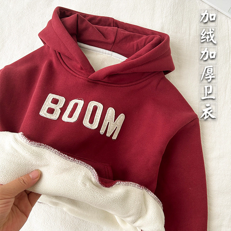 儿童连帽卫衣2024深秋男童加绒加厚贴布刺绣女童宽松宝宝套头卫衣